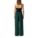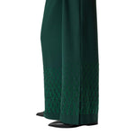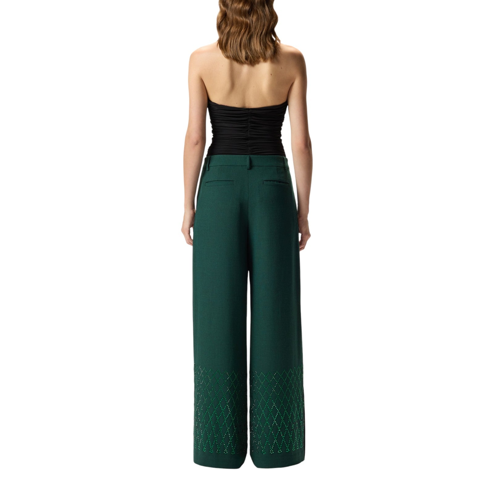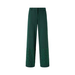 Pantaloni lunghi dalla vestibilità ampia con spacco sul fondo e tasche a filetto sul retro. Il modello presenta un'applicazione di strass di diverse misure e forme che crea un sofisticato disegno geometrico sul fondo. La lavorazione dona al capo un effetto luminoso e prezioso che eleva l'essenzialità della silhouette.