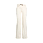 Pantaloni in bull di cotone stretch. Gamba flare. Piega cucita. Tasche sui fianchi. Tasca a filetto sul retro. Lettering LJ in metallo con strass. Chiusura con zip nascosta.