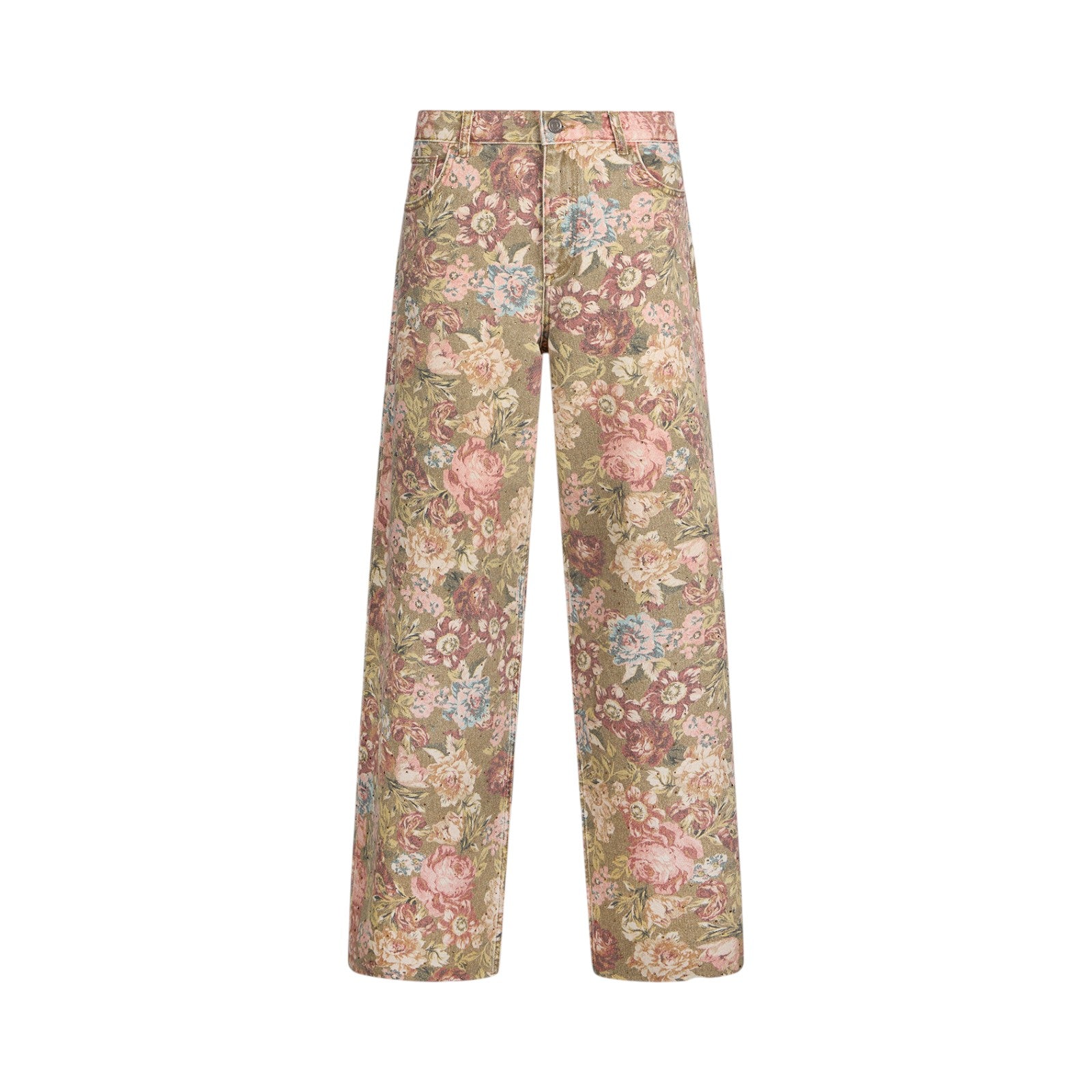 Pantaloni a fiori. Vita alta. Comode tasche. Gamba flare. Chiusura con zip e bottone.