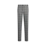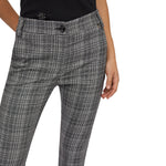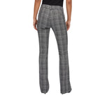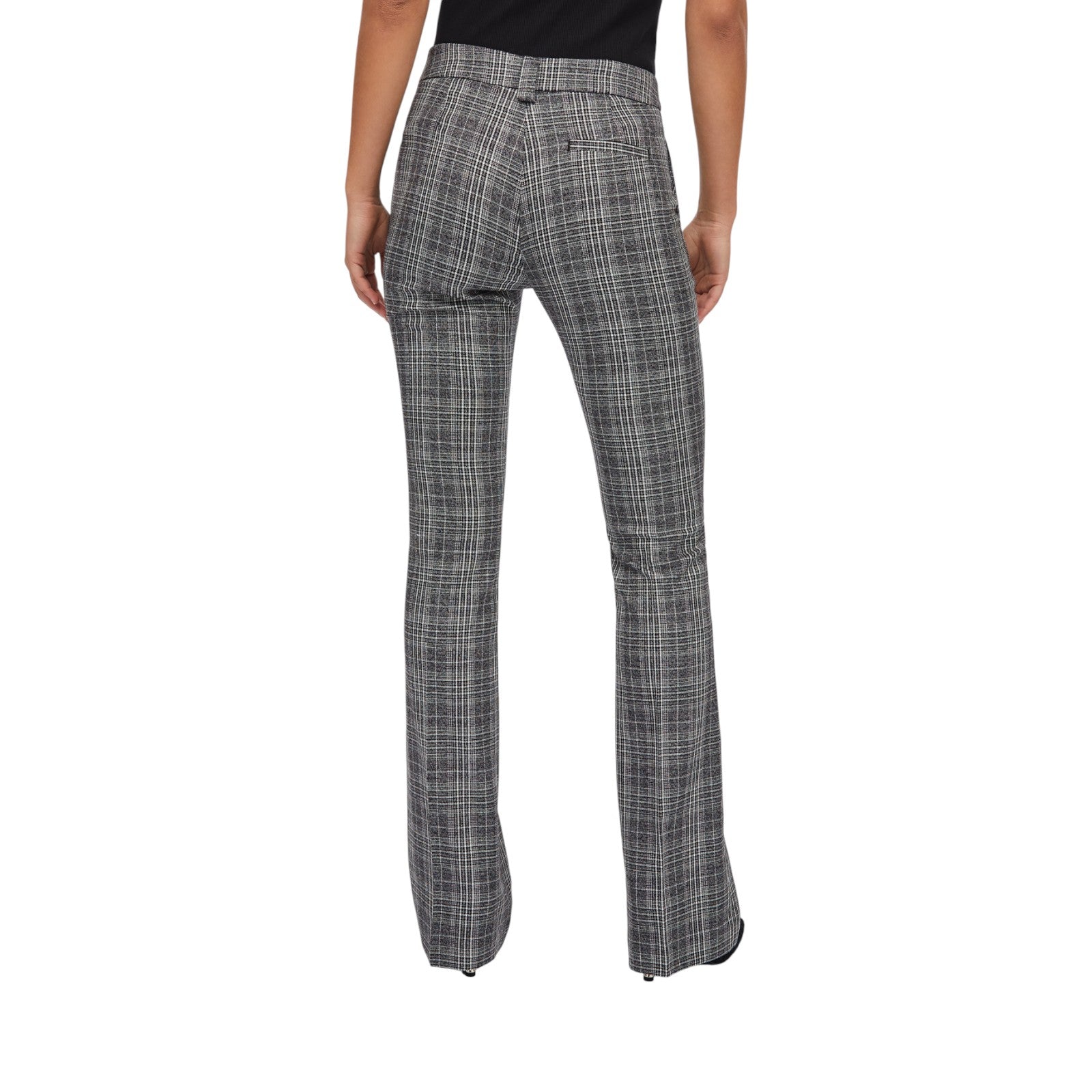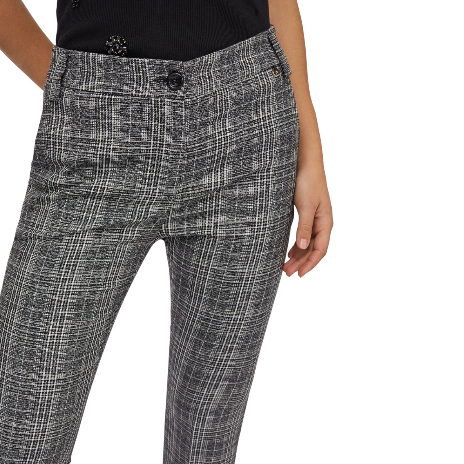 Pantaloni in misto viscosa stretch. Interventi in lurex®. Motivo Principe di Galles. Gamba flare. Tasche sui fianchi. Tasca a filetto sul retro. Logo in metallo. Chiusura con bottone e zip coperta.