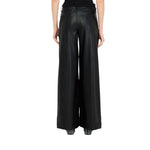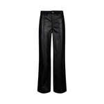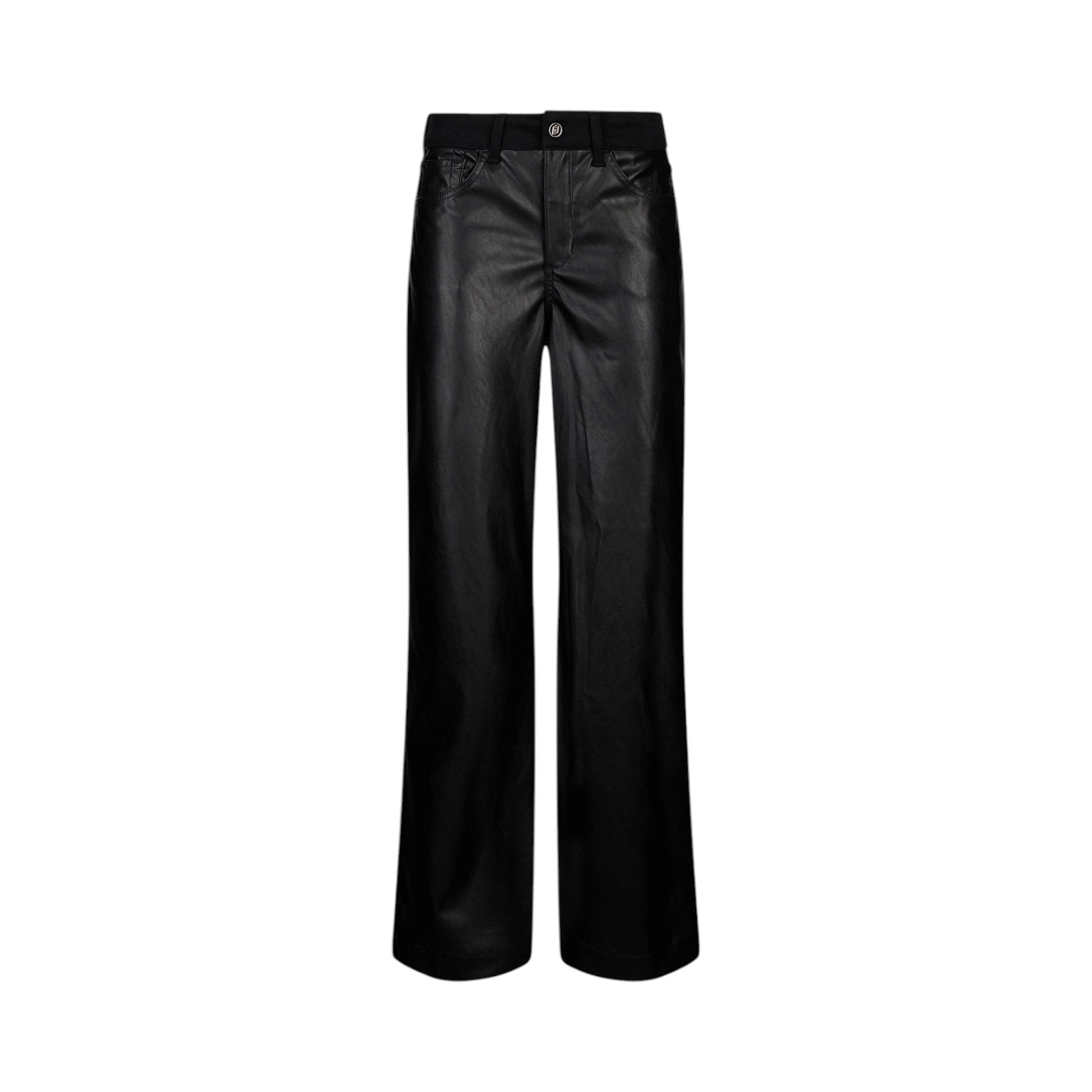 Pantaloni in tessuto effetto spalmato. Lavaggio used. Vita alta. Gamba flare. Modello cinque tasche. Chiusura con bottone e zip coperta.