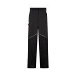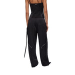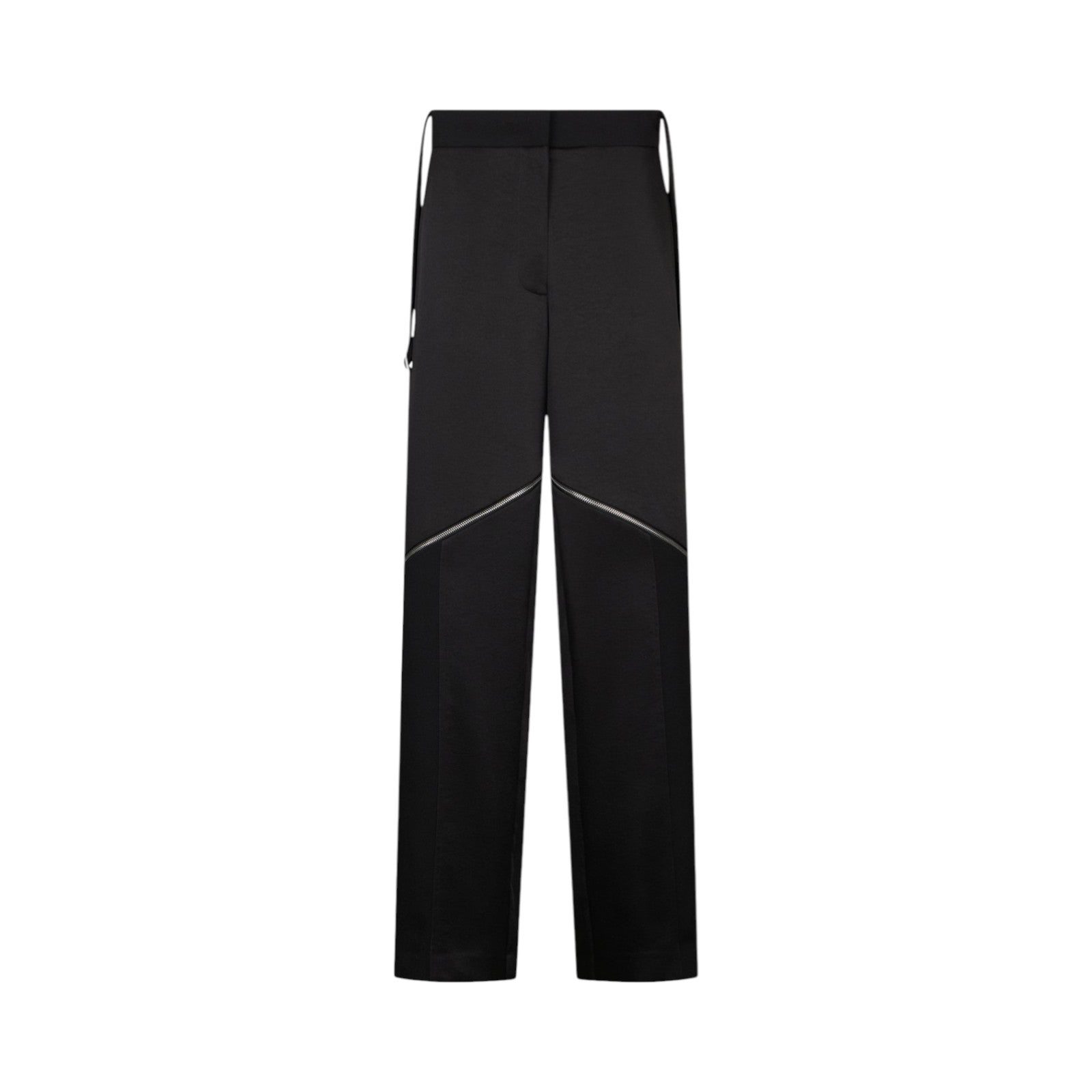 Pantaloni neri in raso e crêpe. Vita alta. Comode tasche Fibbie ton sur ton. Zip decorative sul davanti. Chiusura con zip.
