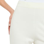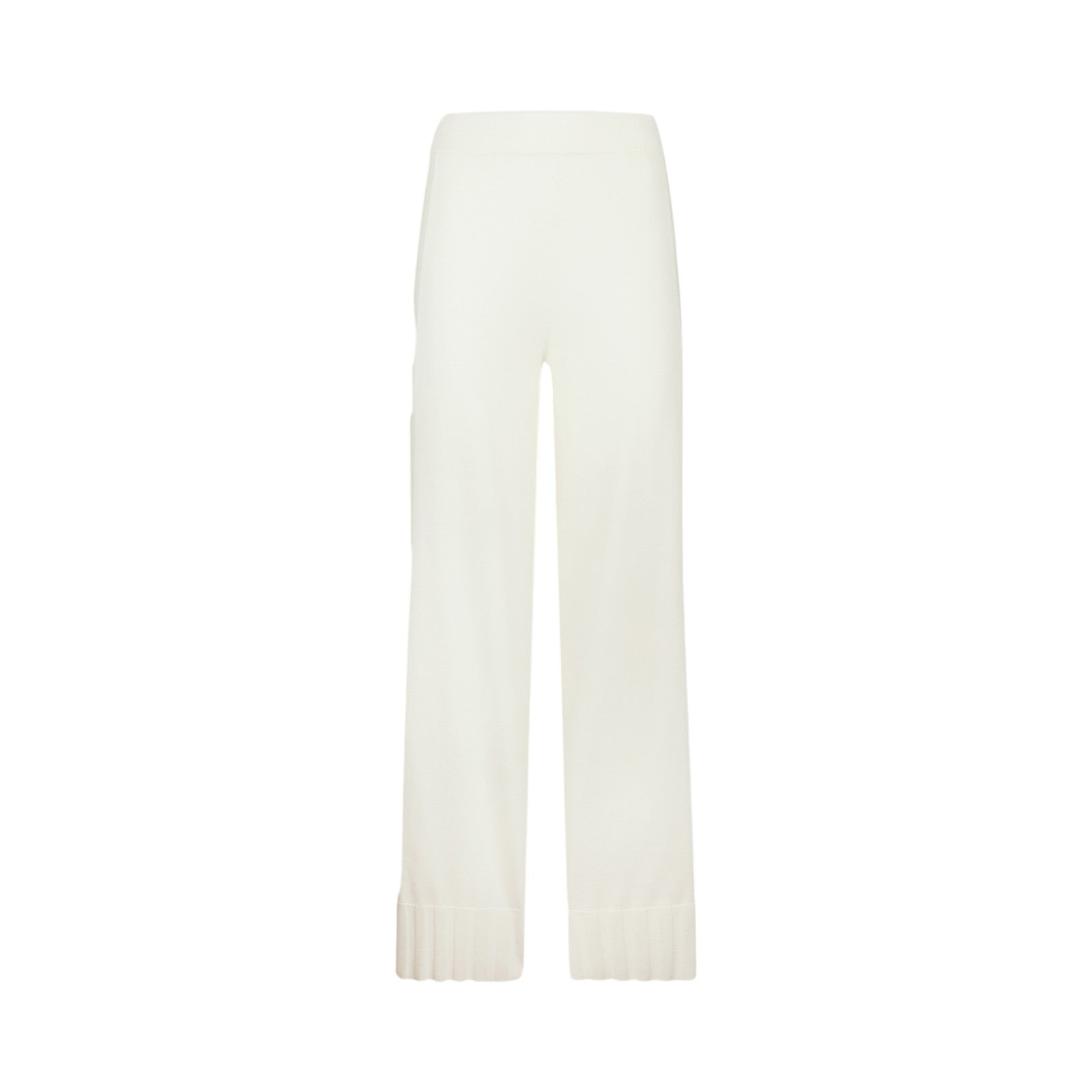 Pantaloni bianchi. Realizzati in maglia di misto viscosa. Lavorazione a righe sui lati. Cintone elastico in vita. Logo in metallo sul retro. La modella è alta 180 cm e indossa la taglia S.