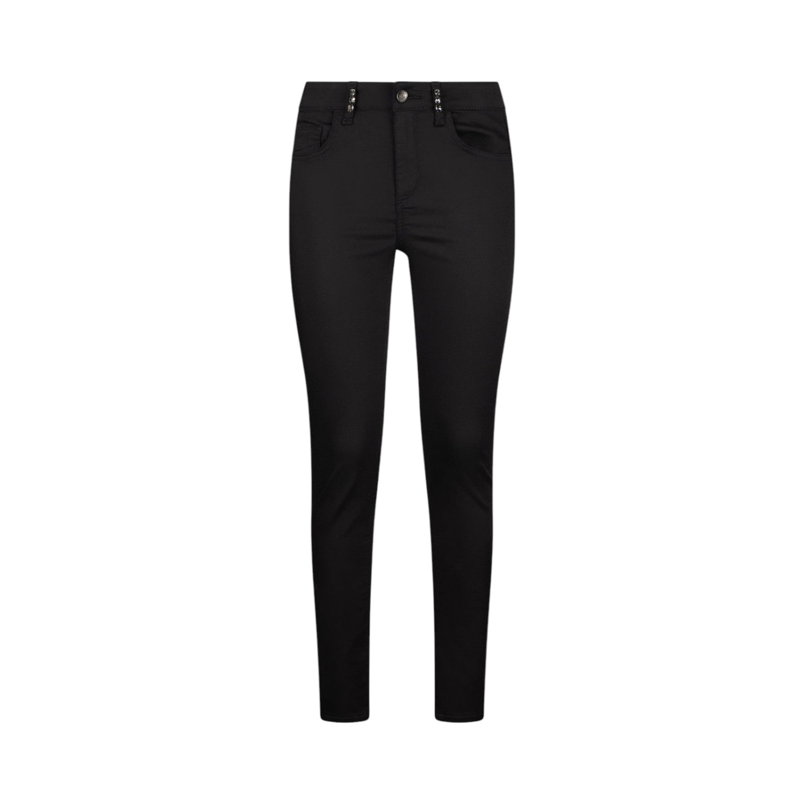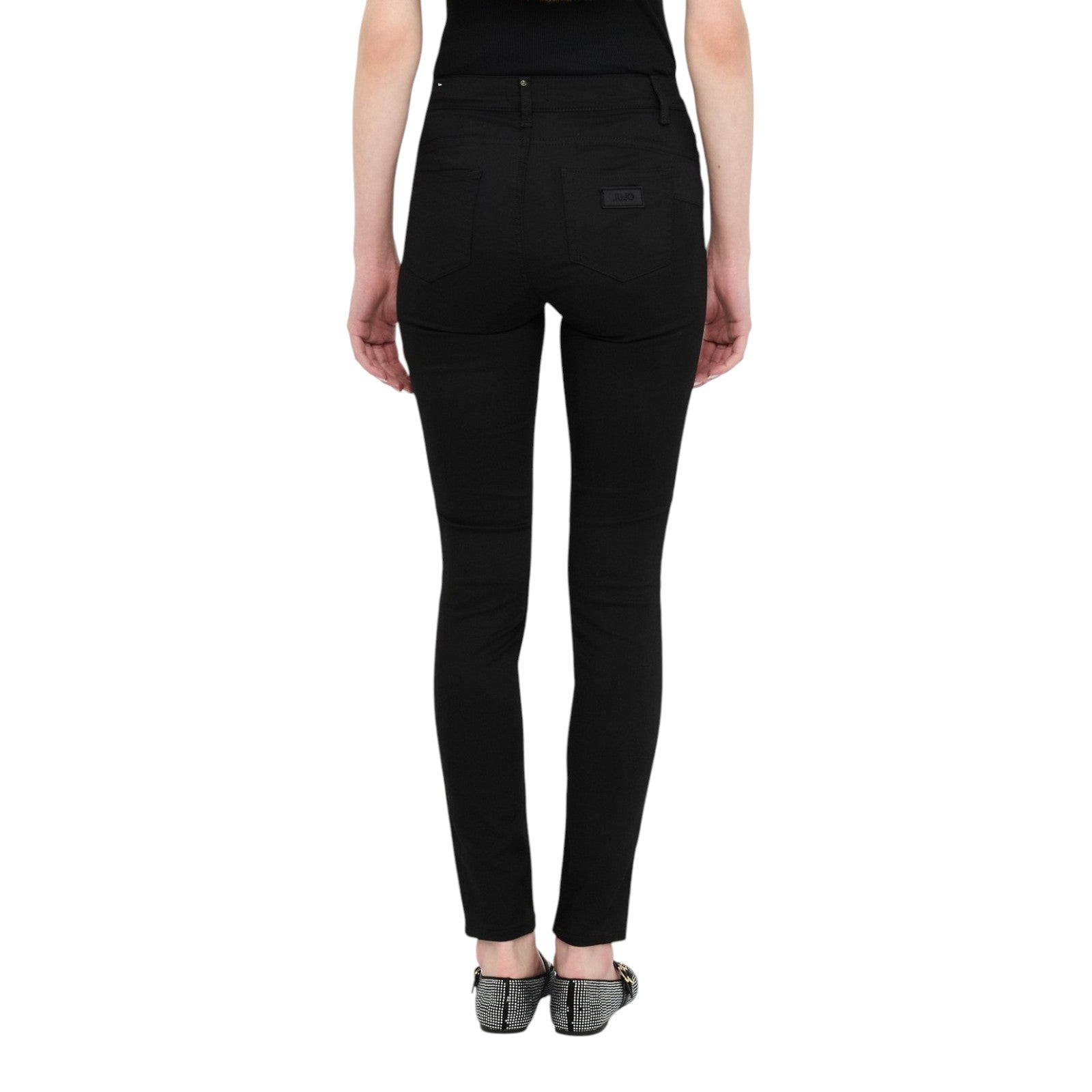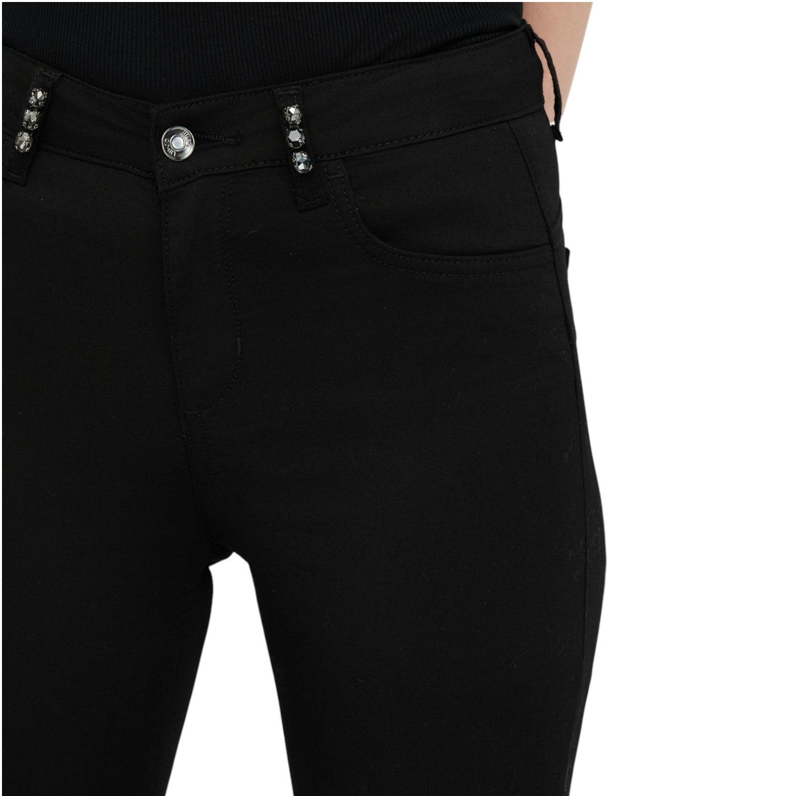 Pantaloni in denim di cotone stretch. Tagli bottom up. Vita alta. Pietre gioiello applicate. Modello cinque tasche. Gamba skinny. Chiusura con zip e bottone. La modella è alta 179 cm e indossa la taglia 27.