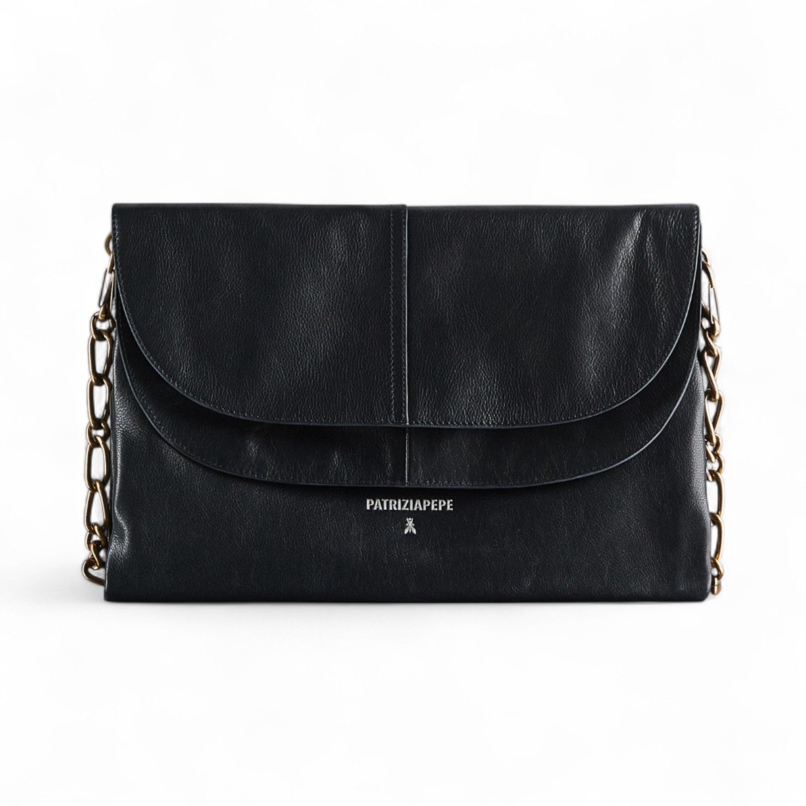 Pelle vitello liscia. Applicazione stampa effetto gommato. Tracolla in pelle regolabile. Tracolla a catena gold brunito. Chiusura a zip nascosta sotto la patta. Fodera maxi logo.