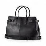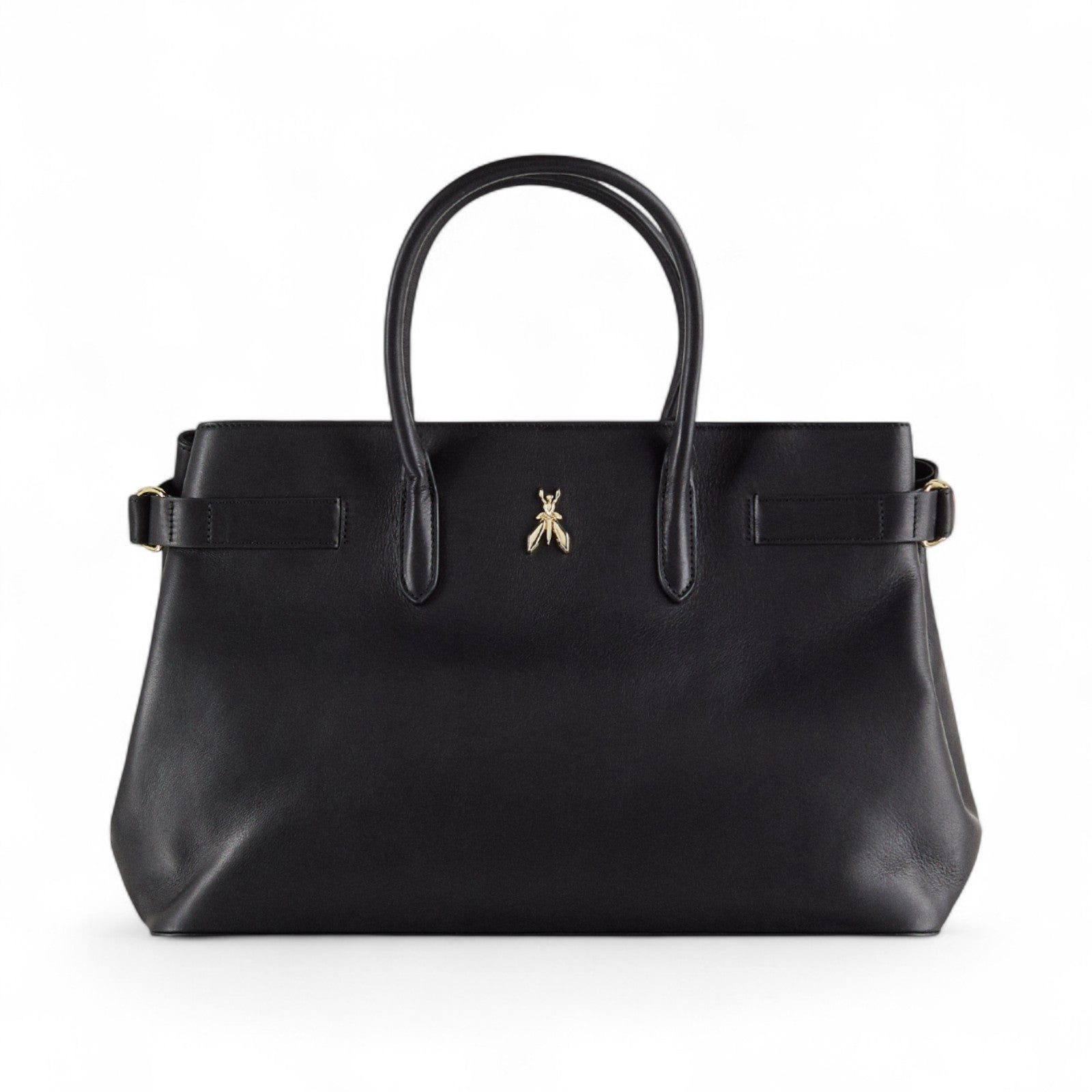Pelle di vitello liscia. Fly in metallo di 35 mm sul davanti Maniglie in pelle scamosciata fisse e tracolla di servizio in pelle scamosciata removibile e regolabile con gemelli. Chiusura con calamita. All'interno presenta una tramezza, una tasca con zip e una tasca aperta. Etichetta in tessuto "PATRIZIA PEPE FLY"