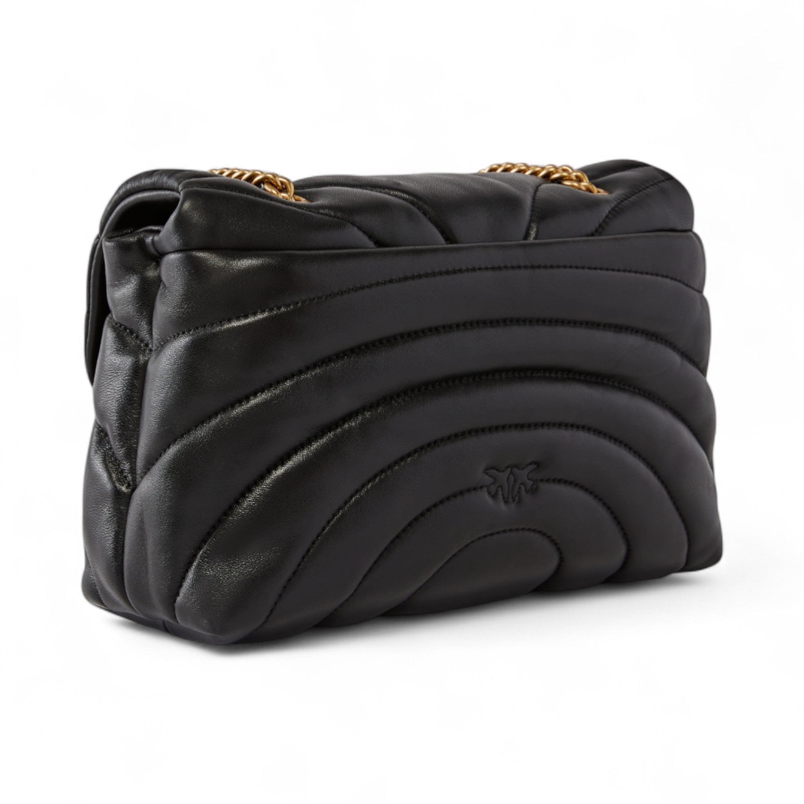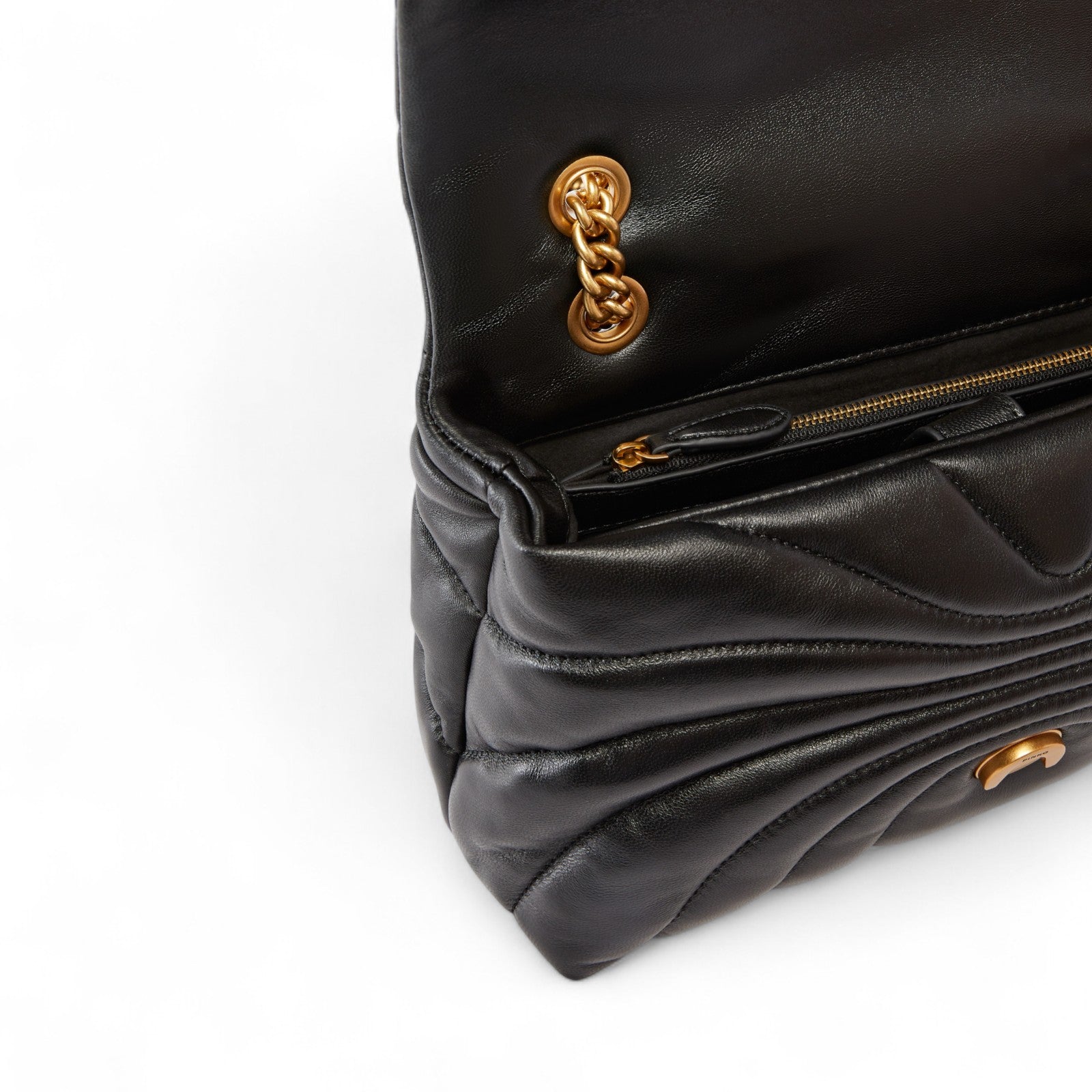 Classica borsa a tracolla Love Bag Puff in nappa morbida trapuntata con maxi pattern obliquo. La chiusura con patta è personalizzata con fibbia iconica in metallo Love Birds Diamond Cut. L'interno è foderato in tessuto scamosciato e include tramezza chiusa con zip e tasca a parete. Completa di tracolla che combina la classica catena metallica rotonda al pratico spallaccio in nappa.