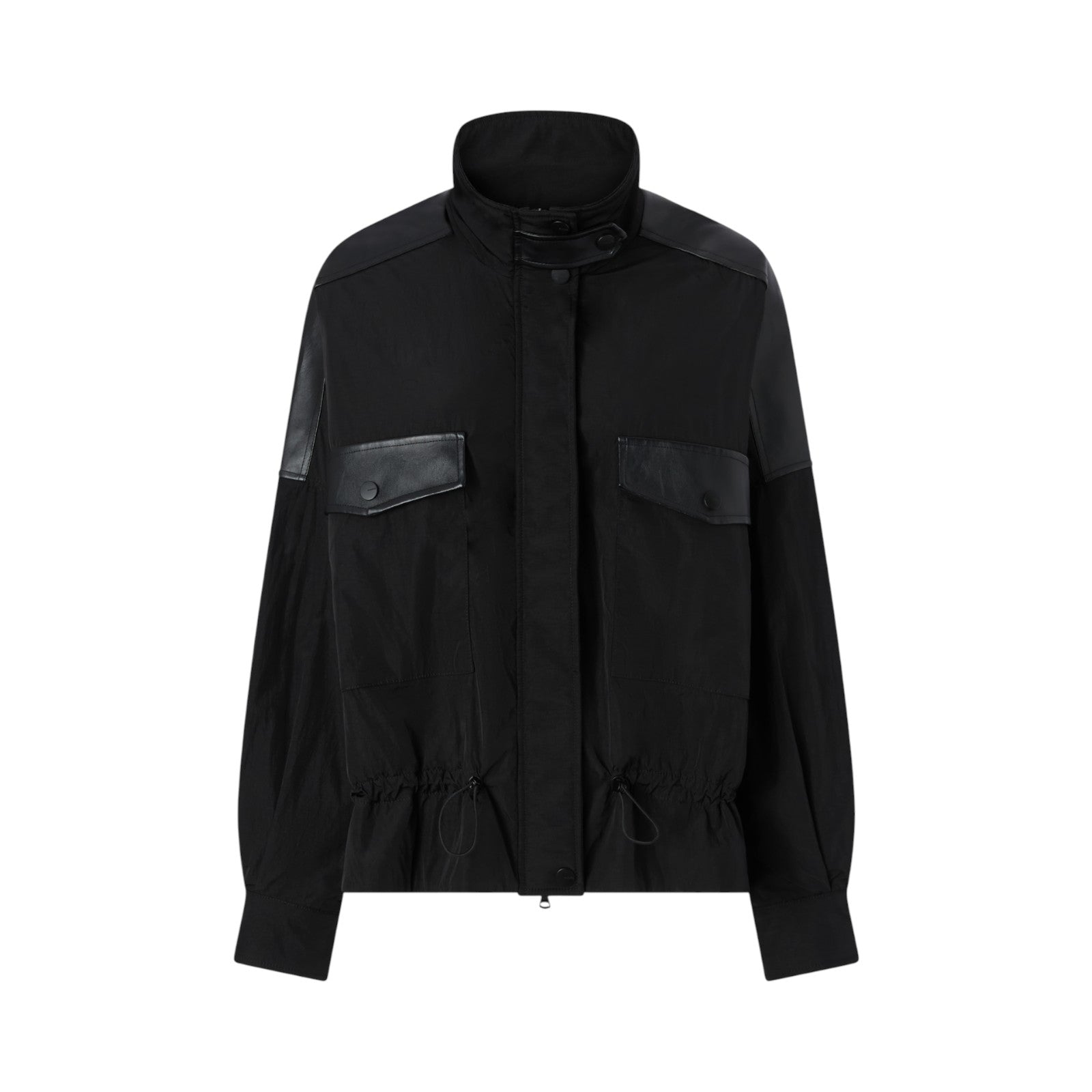 Giacca nera dal design strutturato con collo alto e chiusura frontale a bottoni. Dotata di tasche frontali con patta e bottoni, e coulisse in vita per una vestibilità personalizzabile. Il mix di materiali tecnici e dettagli in pelle rende il capo ideale per look urbani e contemporanei.