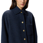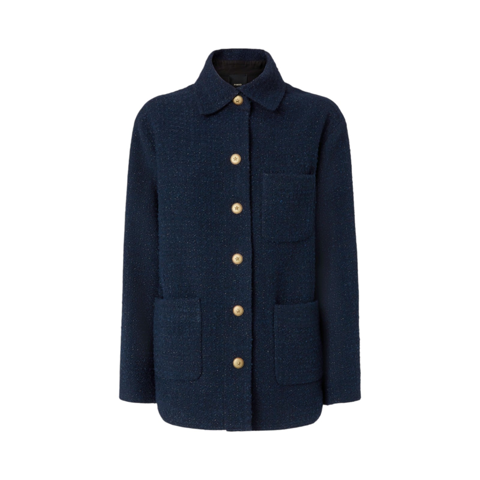 Giacca oversize in tweed accoppiato con colletto classico e chiusura sul davanti con bottoni in metallo decorati da stella. Il modello presenta maniche lunghe a giro ed è dotato di due tasche a toppa applicate sul fondo e di una applicata sul petto.