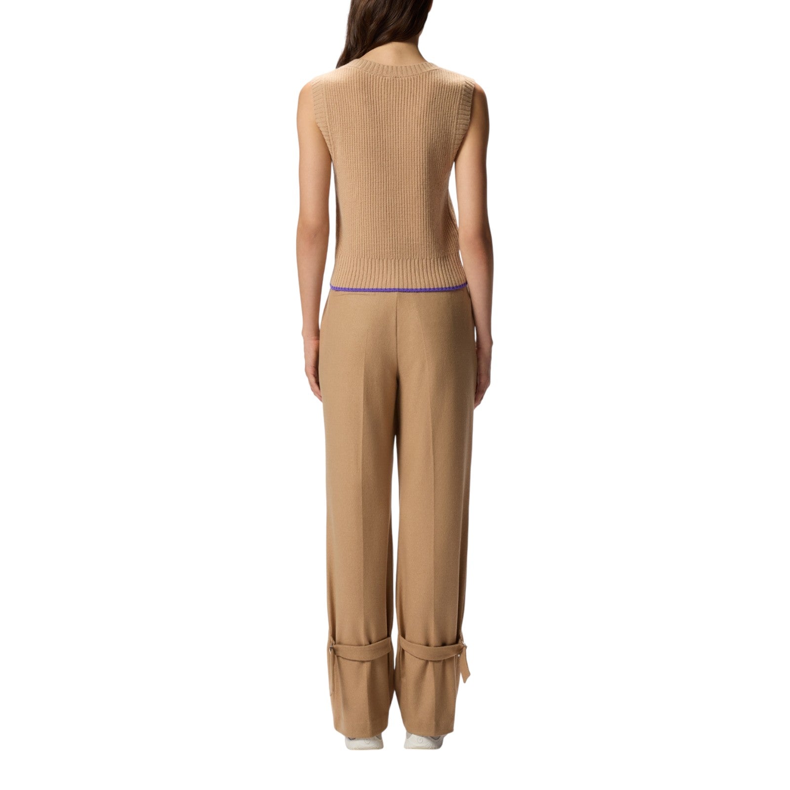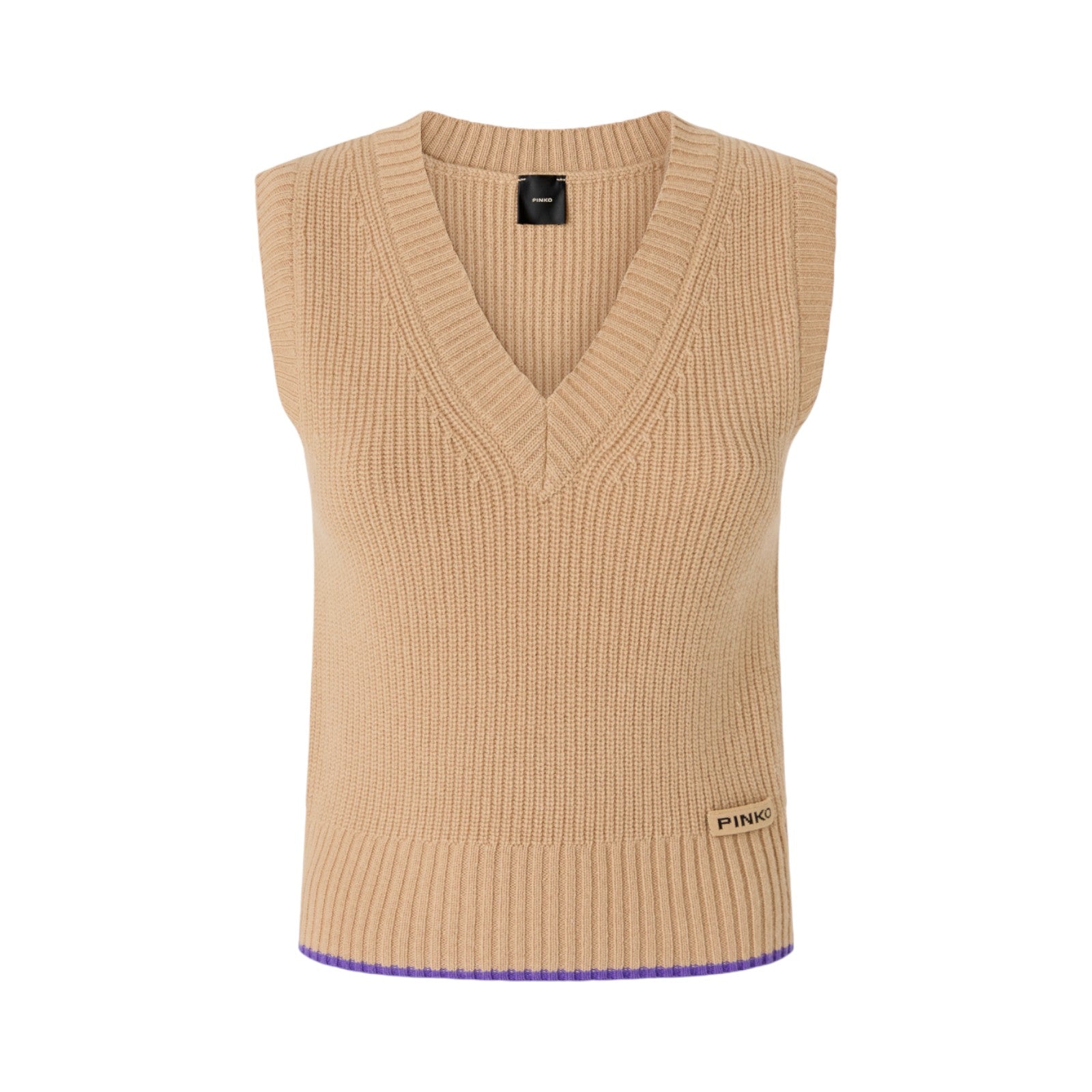 Gilet in un pregiato misto lana merino e cashmere con scollo a V, perfetto per le giornate in ufficio e non solo. Il filato a contrasto a fondo capo è un delicato e inaspettato tocco di classe. Orlo, giromanica e scollo sono lavorati a coste, mentre il tocco finale è dato dall'etichetta tono su tono con logo lettering PINKO sul davanti a lato.
