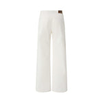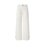 Jeans da donna in bull denim di cotone bianco, con silhouette wide leg dove la gamba dritta e ampia è caratterizzata da una zip metallica laterale, che corre su tutta la lunghezza della gamba in verticale. La zip permette di indossare questi pantaloni a vita bassa sia completamente chiusi, sia aperti, lasciando intravvedere la culotte in satin bordata in pizzo che simula l'effetto di un paio di shorts d'ispirazione lingerie. La personalizzazione prevede la salpa con logo Love Birds impresso a caldo sul retrocinta.