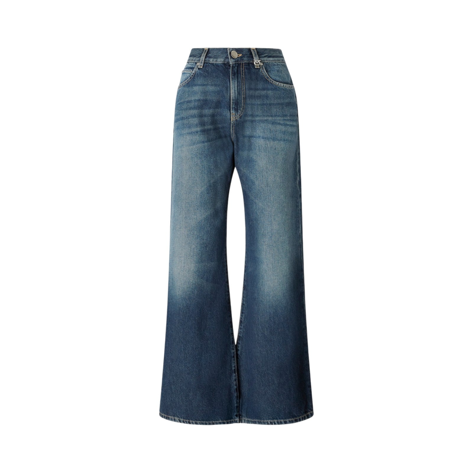 Jeans cinque tasche da donna con silhouette wide leg dalla gamba dritta e ampia, realizzati in soft denim di cotone e lyocell per una mano più fluida e trattati con lavaggio stone wash. A personalizzare il design in puro stile PINKO troviamo il logo lettering del brand ricamato sul retrocinta, il logo Love Birds con uccellini ricamati sulla tasca posteriore destra e il passante rimovibile con logo Love Birds. Passanti per cintura e chiusura frontale con bottone e zip nascosta. Il modello veste in modo un po' più ampio rispetto alla taglia abituale.
