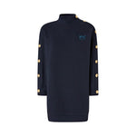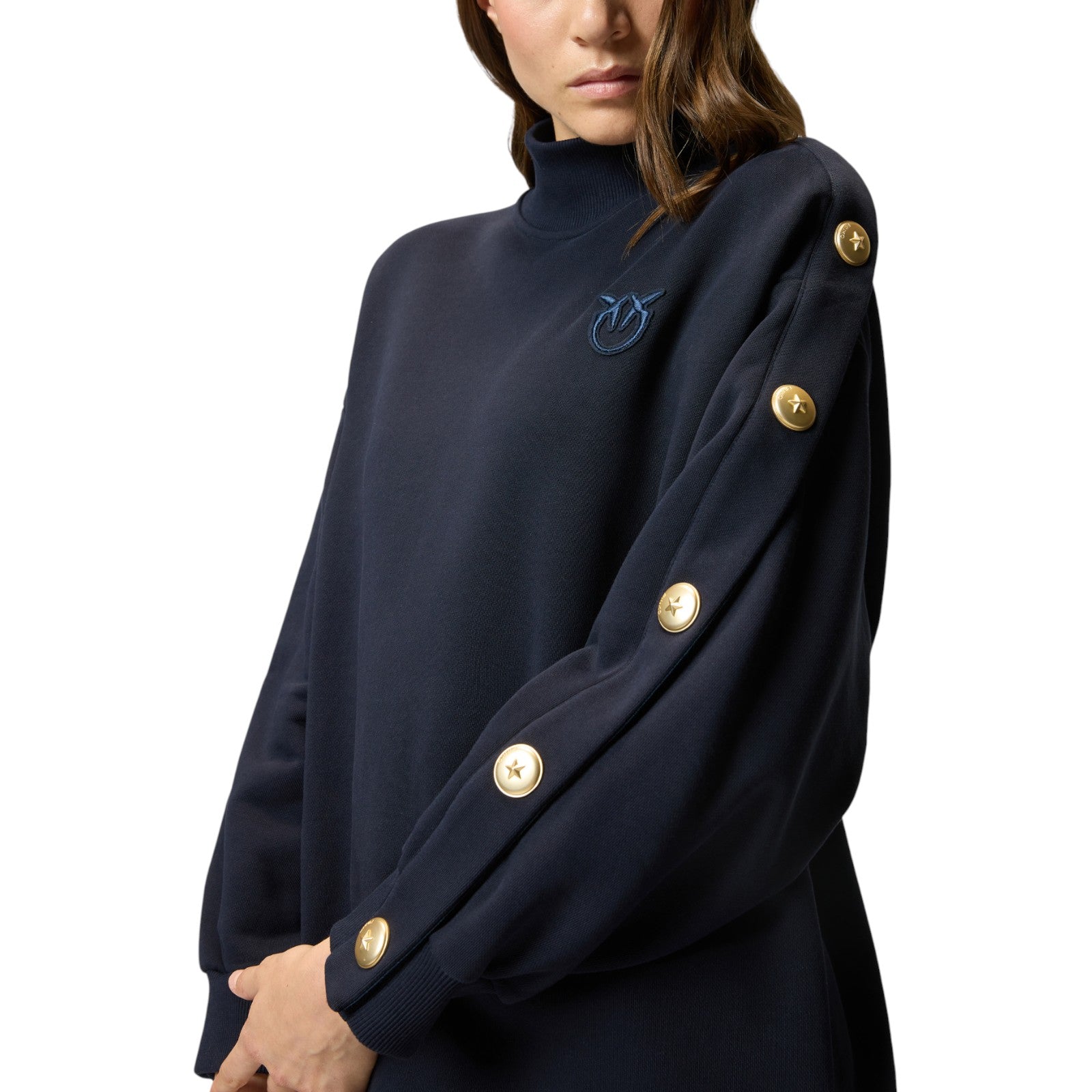 Maxi maglia a maniche lunghe, da indossare anche come abito corto, realizzata in felpa di puro cotone. Il capo risulta particolarmente comodo, grazie alla vestibilità morbida in cui è proposto e a dettagli confortevoli come il collo alto, i polsi e il fondo lavorati a costine. Il modello non rinuncia comunque a un tocco di personalità in puro stile PINKO, dato dalla patch con logo Love Birds ricamato sul davanti lato cuore, e dai bottoni in metallo decorati da stella che profilano le maniche e l'apertura laterale del collo.