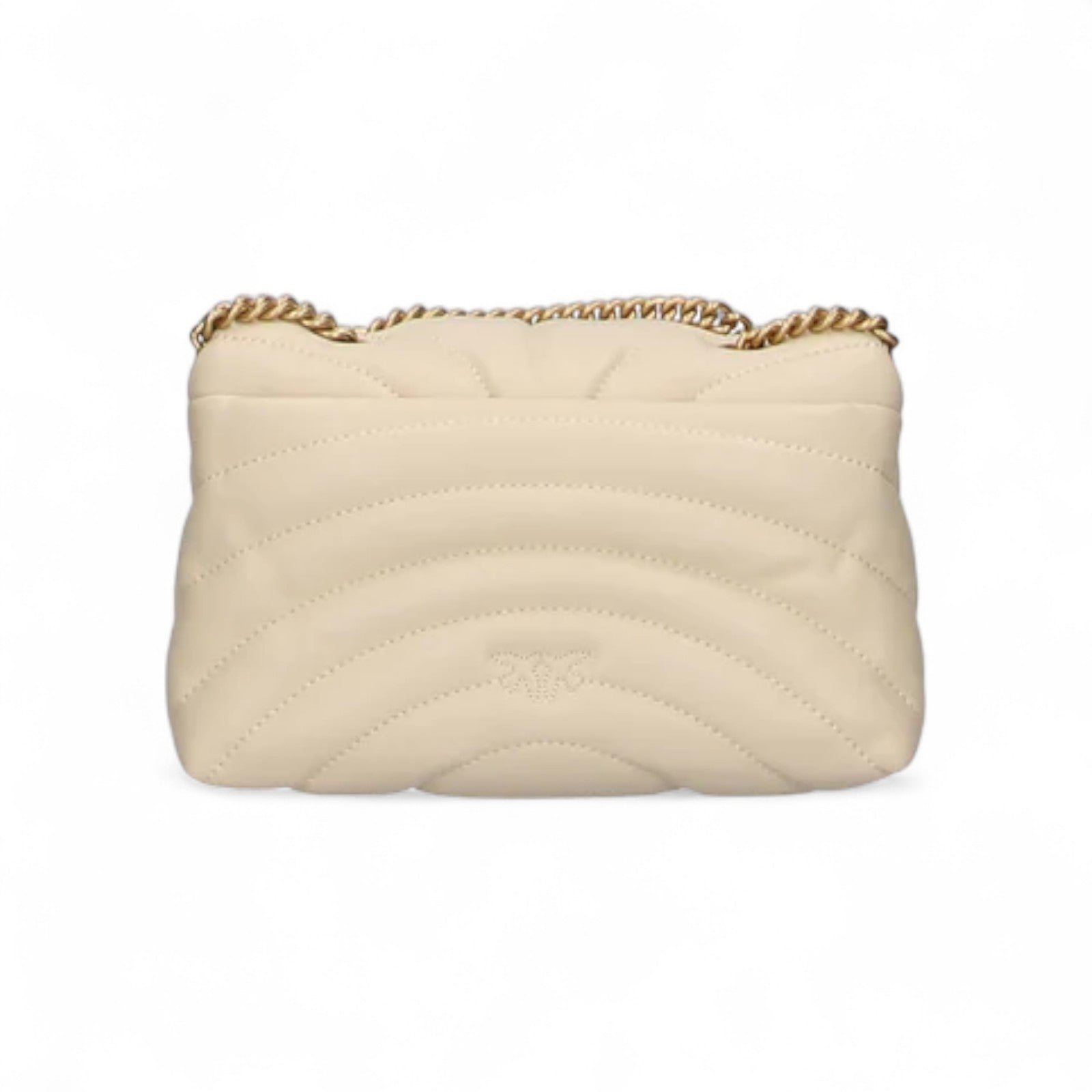 Borsa piccola morbida a tracolla Mini Love Bag Puff in nappa con trapuntatura Butterfly, che ricorda la caratteristica sagoma delle ali di farfalla. La tracolla a catena in metallo con spallaccio in nappa è scorrevole, e può essere doppiata per indossare la borsetta a spalla. La chiusura con patta è completata dall'iconica fibbia in metallo Love Birds Diamond Cut, galvanica antique gold. L'interno è foderato in microfibra scamosciata e comprende una pratica tramezza chiusa con zip e una tasca interna, per una migliore gestione dello spazio.