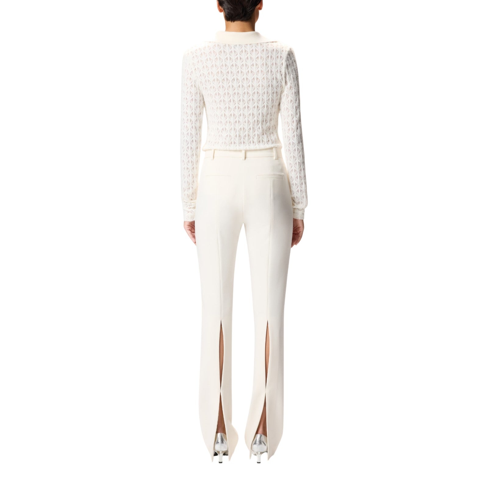 Pantaloni lunghi dalla vestibilità slim caratterizzati da uno spacco sul retro che parte dal ginocchio e che può essere regolato tramite un bottone a metà lunghezza per personalizzarne l'apertura. Il tessuto in viscosa tecnica riesce a unire morbidezza e fluidità creando una texture sofisticata che offre comfort e vestibilità ottimali, senza perdere l'aspetto strutturato del design.