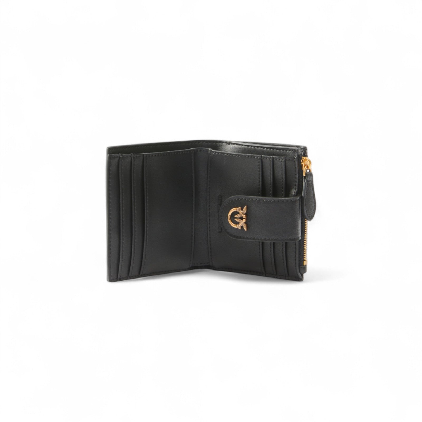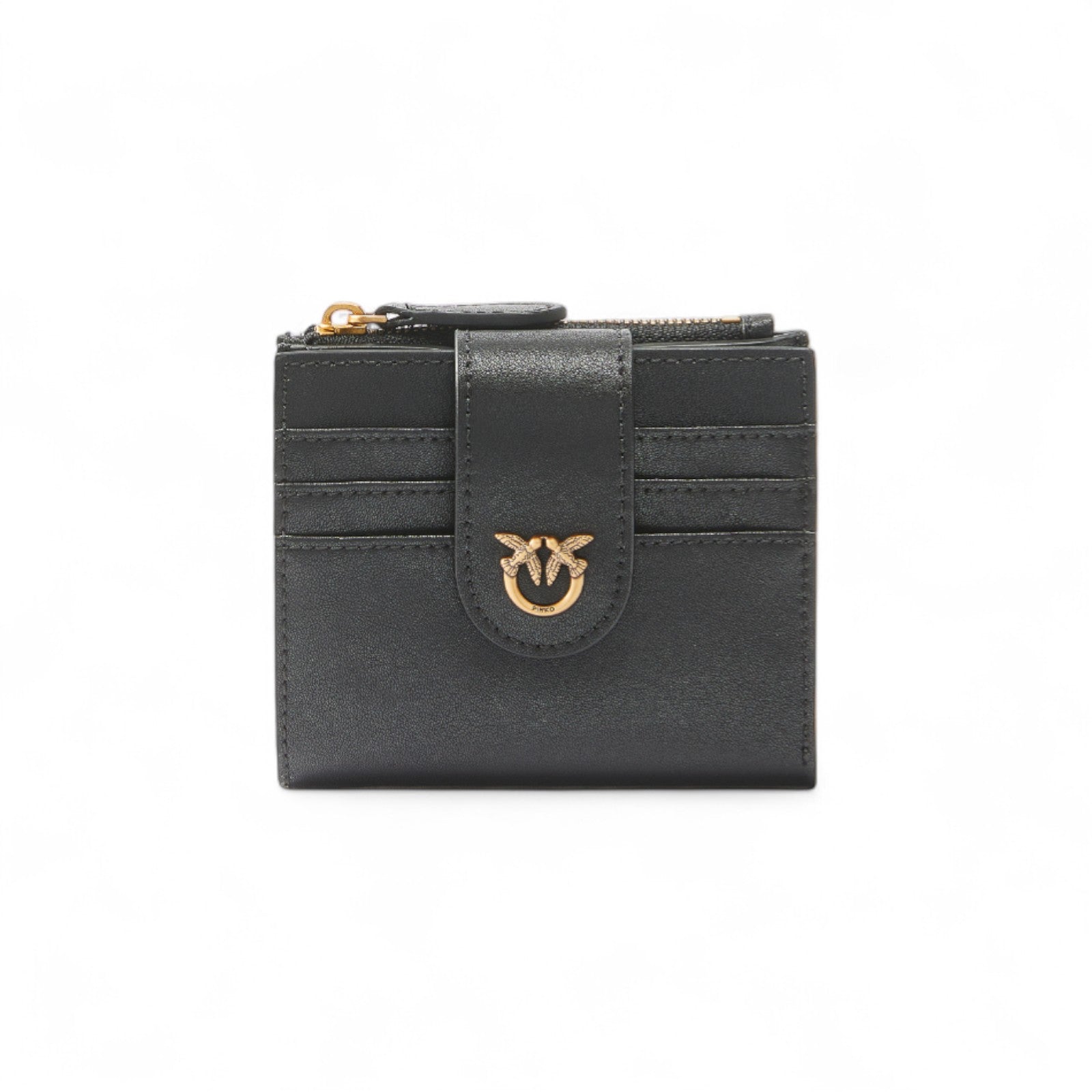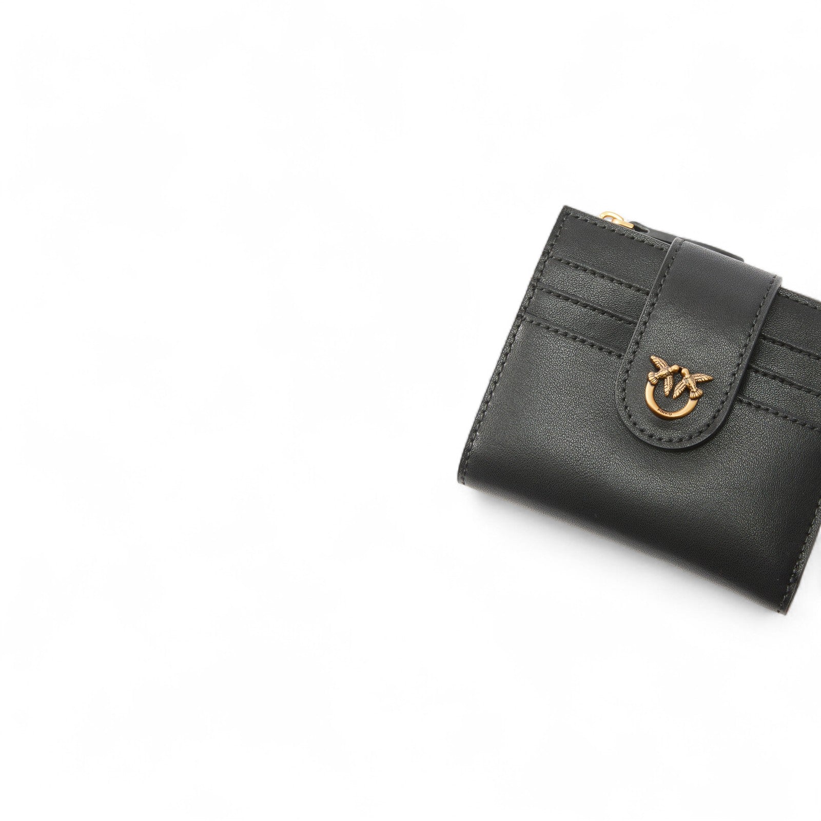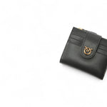Piccolo portafoglio dalla forma squadrata in morbida pelle dalla particolare texture liscia che comprende numerosi spazi per carte di credito e documenti e una tasca portamonete chiusa con zip. La chiusura con piccola fascia è personalizzata con placchetta logo uccellini Love Birds in metallo, che aggiunge un tocco iconico a un accessorio da aggiungere alla tua borsa.