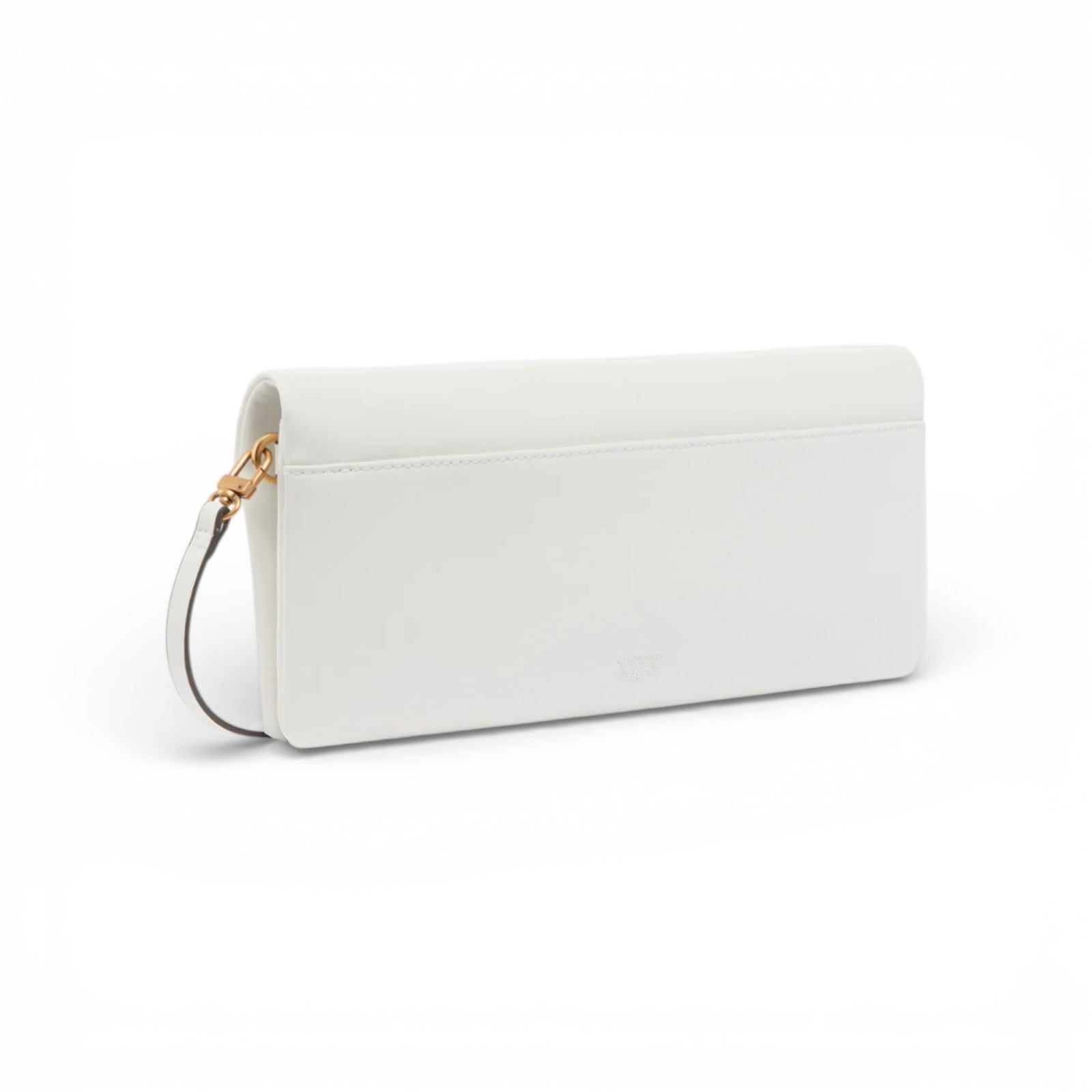 Pochette Love Bag Click Soft Horizontal di medie dimensioni dal design piatto e dalla forma rettangolare, realizzata in morbida pelle. La borsetta, imbottita e personalizzata dall'iconico logo metallico Love Birds Diamond Cut sul davanti, può essere indossata a spalla, crossbody oppure a mano grazie alla tracolla in pelle rimovibile, decorata da anellini in metallo che formano il logo lettering PINKO. La chiusura con due bottoni interni a calamita rivela un interno foderato in drill di cotone con tasca a parete chiusa da zip.