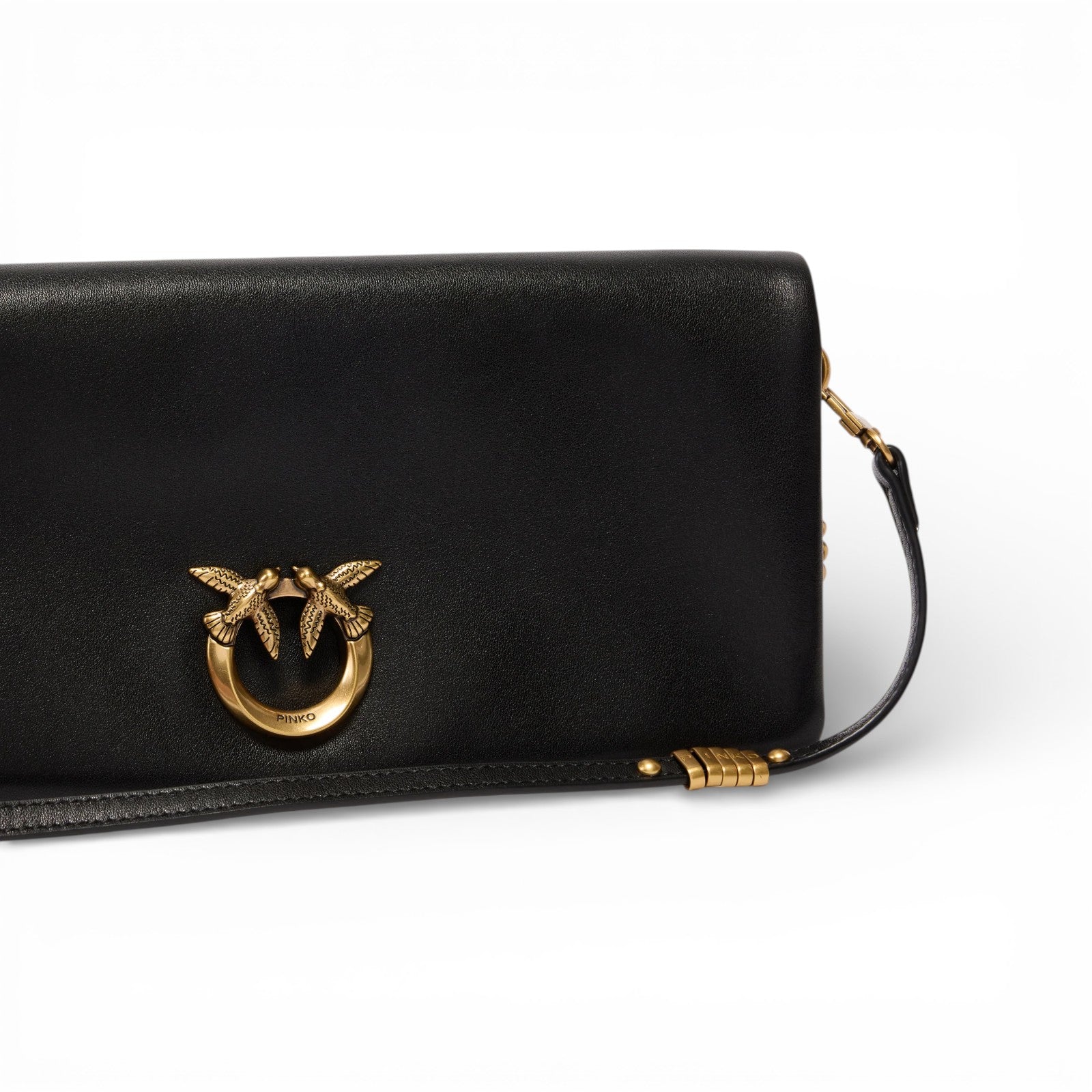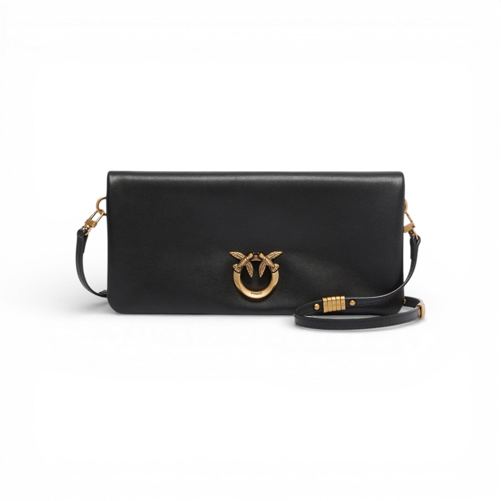Pochette Love Bag Click Soft Horizontal di medie dimensioni dal design piatto e dalla forma rettangolare, realizzata in morbida pelle. La borsetta, imbottita e personalizzata dall'iconico logo metallico Love Birds Diamond Cut sul davanti, può essere indossata a spalla, crossbody oppure a mano grazie alla tracolla in pelle rimovibile, decorata da anellini in metallo che formano il logo lettering PINKO. La chiusura con due bottoni interni a calamita rivela un interno foderato in drill di cotone con tasca a parete chiusa da zip.