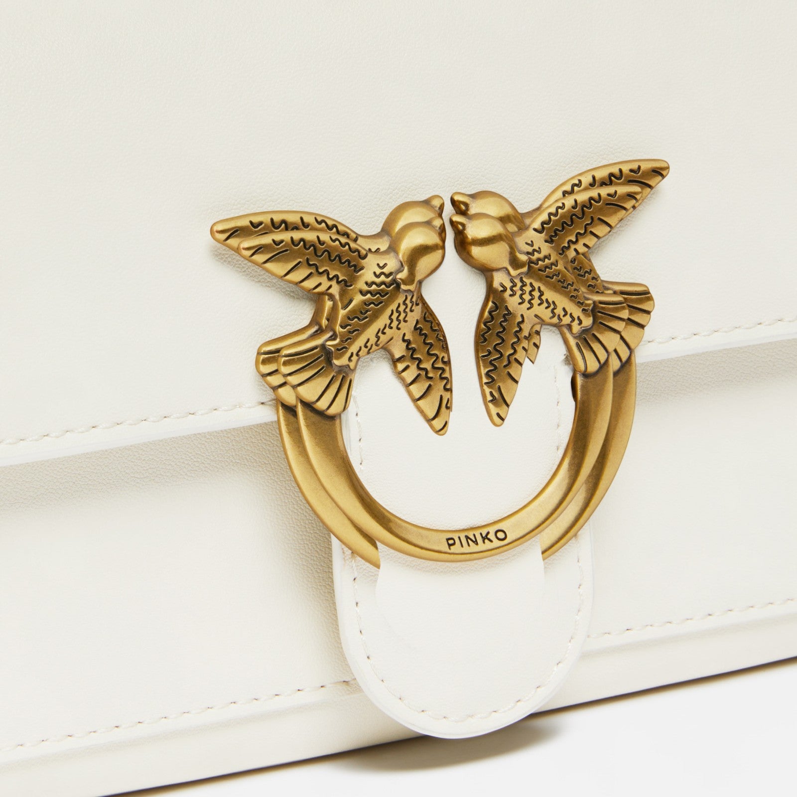 Portafoglio Love Bag a tracolla in morbida pelle mano seta. La chiusura con bottone nascosto è completata dall'iconica fibbia in metallo Love Birds Diamond Cut. L'interno è foderato in microfibra e comprende tramezza chiusa con zip e spazi per carte di credito. La tracolla metallica a catena rotonda permette di portare il portafoglio come una borsa crossbody, ed è rimovibile.