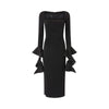 Vestito lungo elegante e aderente con maniche lunghe e scollo quadrato. La linea dell'abito segue ed esalta le forme del corpo, con spacco centrale a fondo capo sul retro. Il modello è realizzato in tessuto di viscosa elasticizzata, che si traduce in una vestibilità ottimale: il materiale è progettato per aderire perfettamente alle linee del corpo, esaltando la silhouette in modo naturale e definito. I volant laterali a chiocciola mostrano il tessuto in raso creando un contrasto tra lucido e opaco che esalta la texture.