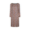 Abito in twill di viscosa dalla stampa geometrica, trend della stagione. Scollo a barchetta, polsi con spacchi decorati da bottoni Monogram.