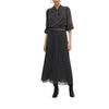 Elegante abito lungo con stampa a pois. Realizzato in tessuto leggero, si distingue per la caduta fluida e il fiocco al collo. Maniche a sbuffo con polsini elastici e vita aderente con dettaglio di nastro.