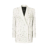 Blazer dalla vestibilità dritta con bottone invisibile, tasche sul davanti e taschino sul petto, realizzato in pregiato tessuto di poly viscosa. Perfetta unione di eleganza e artigianalità, questo modello è decorato da ricami con cristalli scintillanti e perle sulla parte frontale e sulle maniche.
