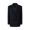 Giacca blazer doppiopetto dal look maschile, caratterizzata da una linea dritta con spacco centrale sul retro, da tasche con pattina e da un collo a revers con lance abbassate. Il tessuto utilizzato è un classico gessato in lana poly caratterizzato da un cambio di tessitura e di luce a sottolineare il disegno del materiale.