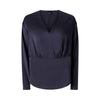 Blusa dal volume fluido in satin di seta stretch. Il design si caratterizza per lo scollo a V, l'orlo stondato, le maniche lunghe con spalla scesa e il pannello frontale che crea un leggero arriccio.