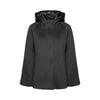 Caban in tessuto scuba ultrastretch con cappuccio staccabile in nylon trapuntato. Maniche raglan e fondo arrotondato, bottoni automatici cuciti a mano.