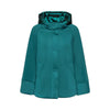Caban in tessuto scuba ultrastretch con cappuccio staccabile in nylon trapuntato. Maniche raglan e fondo arrotondato, bottoni automatici cuciti a mano.