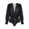 Body in georgette dalla vestibilità slim. Ha spalle strutturate, scollo a V ingentilito da raffinati drappeggi e maniche lunghe con polsi alti e spacchetti impreziositi da bottoni in metallo dorato con logo.
