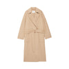 Cappotto lungo doppiopetto in misto lana spigata con cintura.