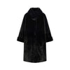Cappotto dècontractè, realizzato in un soffice tessuto double face: dal lato esterno a pelo lungo ed internamente con effetto scamosciato. Linea morbida, collo in piedi, tasche, fondo manica con possibilità di risvolto, sfoderato.