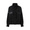 Giacca nera dal design strutturato con collo alto e chiusura frontale a bottoni. Dotata di tasche frontali con patta e bottoni, e coulisse in vita per una vestibilità personalizzabile. Il mix di materiali tecnici e dettagli in pelle rende il capo ideale per look urbani e contemporanei.