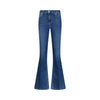 Jeans in denim di cotone stretch. Tagli bottom up. Lavaggio used. Vita alta. Gamba flare. Modello cinque tasche. Salpa logata. Logo in metallo. Chiusura con bottone e zip nascosta.