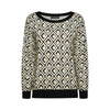Maglia dalla stampa geometrica realizzata con tecnica digitale. Scollo a barchetta, bordi neri a contrasto.