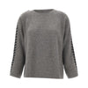 Maglia Elena Mirò in pura lana grigia, impreziosita da un ricamo a mano a contrasto che dona un tocco artigianale e raffinato. Presenta maniche lunghe, scollo a barchetta e bordi a costine per una vestibilità confortevole. Regular fit.