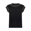 Maglia maniche corte con borchie applicate attorno alla scollatura e a fondo manica. Linea dritta e bordi a coste.