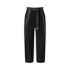 Pantalone nero dalla silhouette ampia e contemporanea, realizzato in tela tecnica opaca con inserti laterali in tessuto spalmato lucido per un contrasto materico sofisticato. Vita alta con cintura integrata e fibbia in metallo, che valorizza la figura e aggiunge un dettaglio distintivo. Lunghezza alla caviglia con orlo leggermente arricciato per un effetto relaxed-chic.
