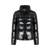 Piumino imbottito dalla silhouette caban in tessuto crystal nylon dal particolare finishing lucido, personalizzato da patch logo Love Birds su una manica. Il modello è caratterizzato da una trapuntatura orizzontale, leggermente obliqua sul davanti, ed è dotato di un avvolgente collo alto con bottoni nascosti per proteggerti dal freddo. Chiusura con zip a doppio cursore in metallo davanti.