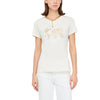 T-shirt in jersey di cotone stretch. Stampa grafica laminata con strass. Scollo rotondo. Maniche corte.