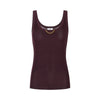 Top in maglia realizzato con filato di viscosa e seta. La lavorazione a costine arricchisce la texture mentre il dettaglio gioiello in catena aggiunge movimento e luce. L'etichetta con logo sul retro completa il capo. Vestibilità aderente.