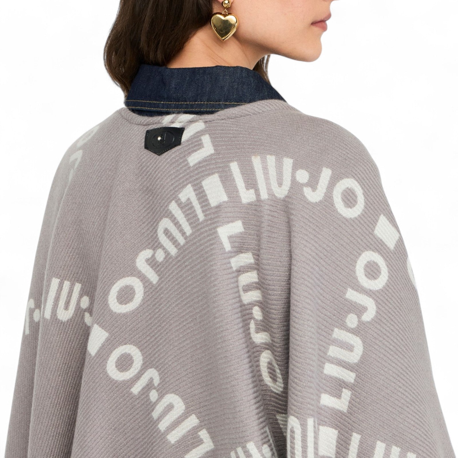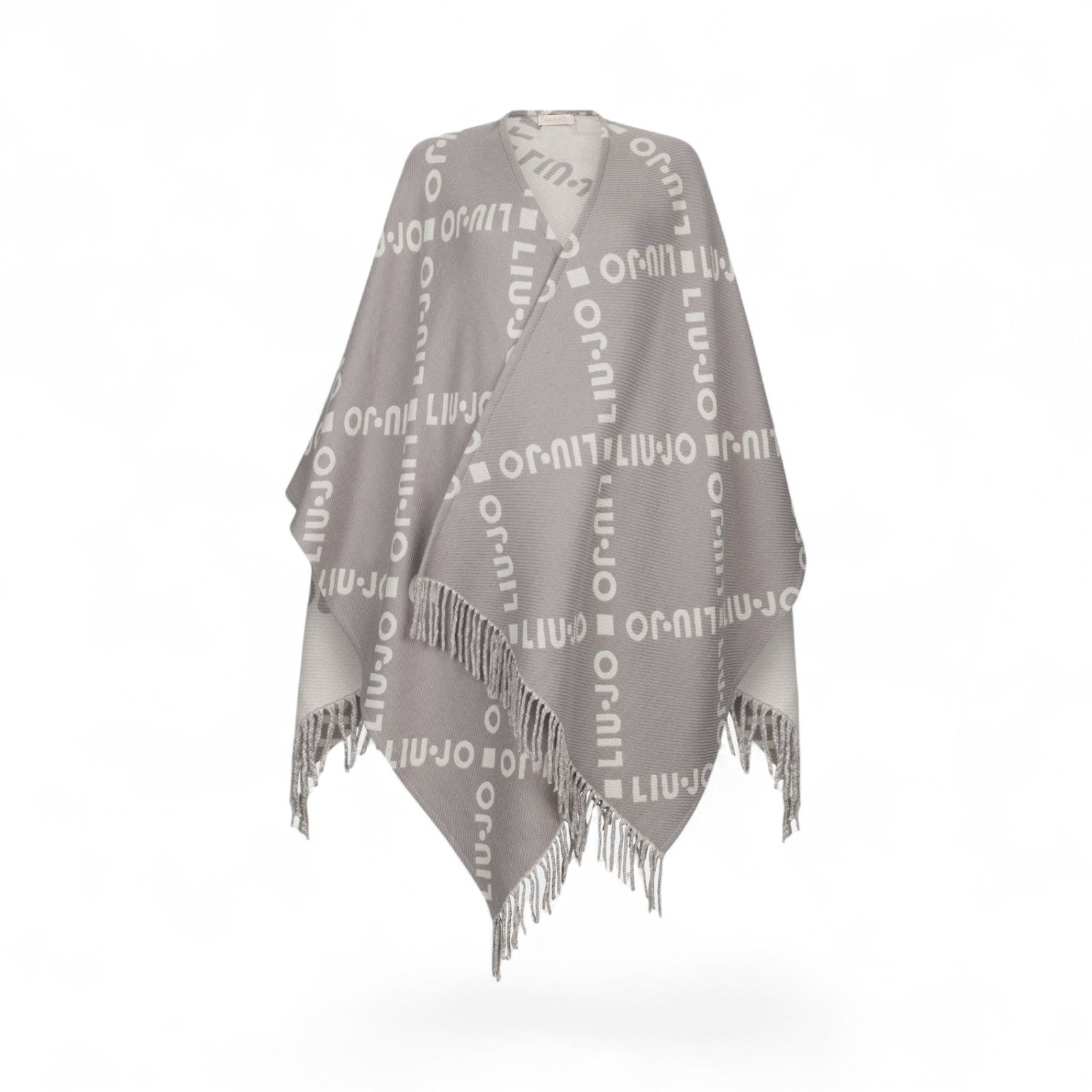 Poncho grigio. Bordi con frange. Logo jacquard. Patch logata sul retro.
