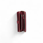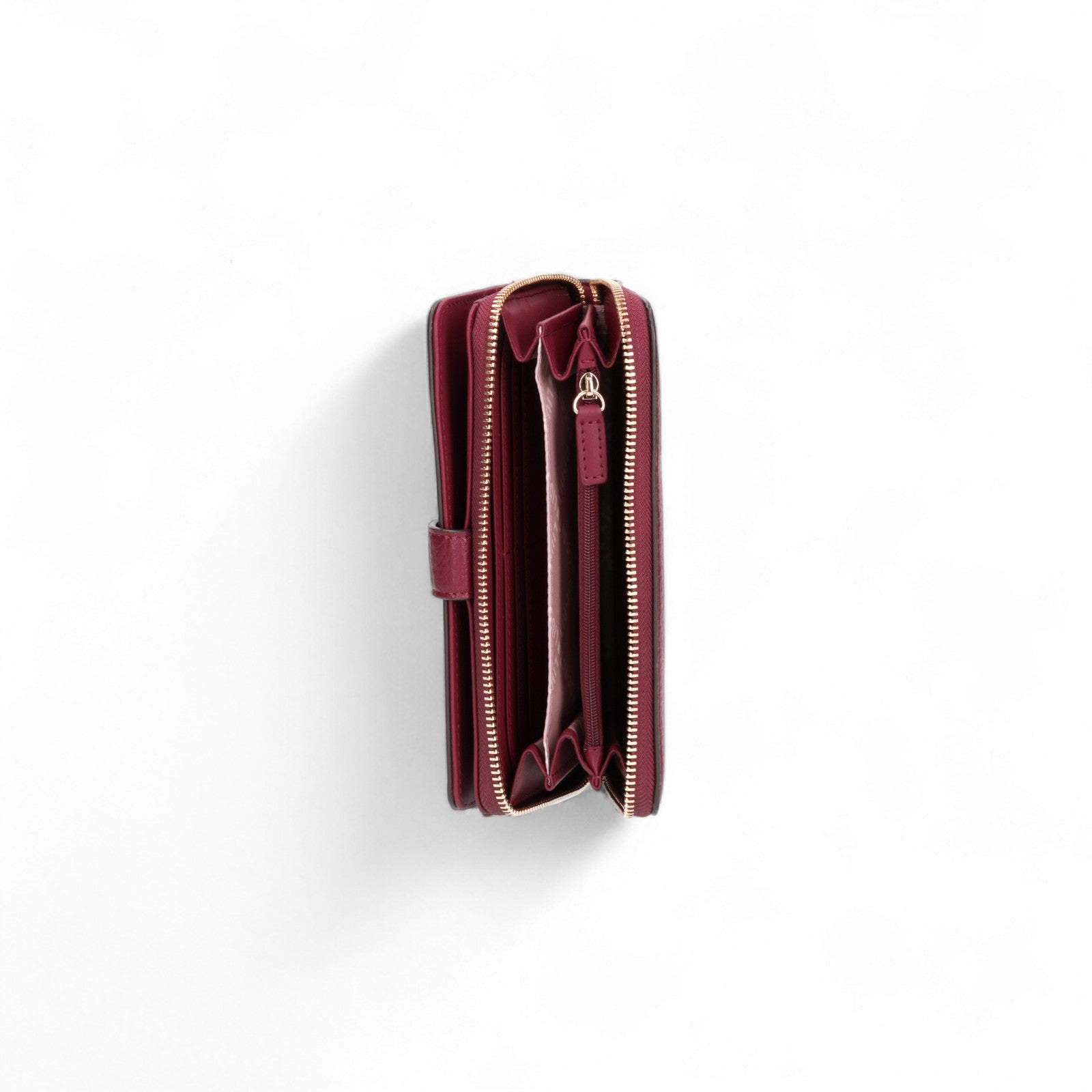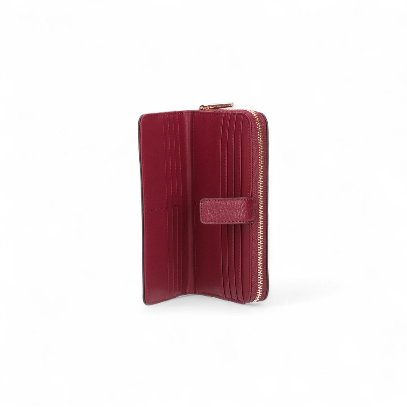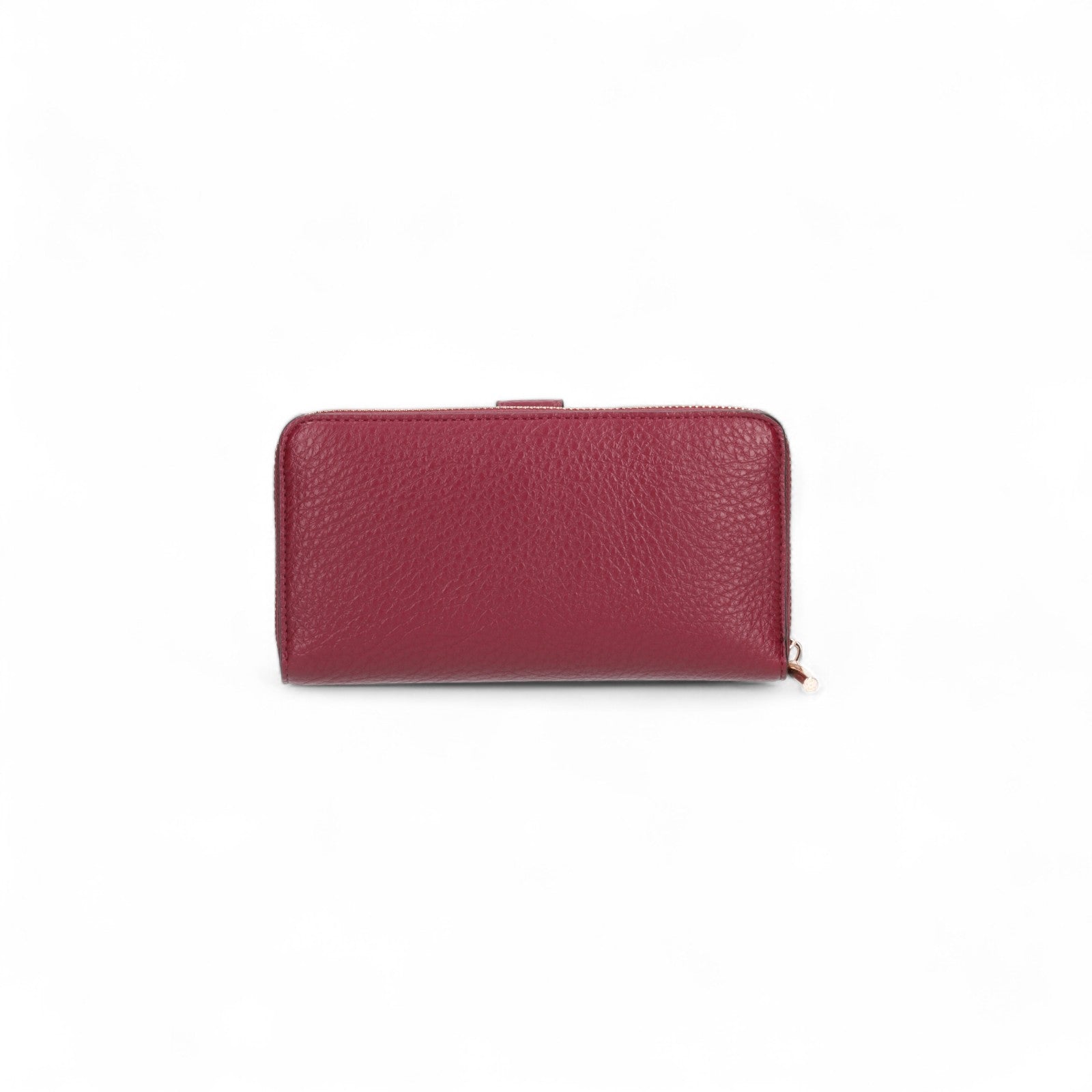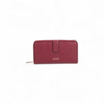 Portafoglio XL Liu Jo da donna in ecopelle martellata bordeaux con rifiniture dorate lato con bottone con scomparti per banconote e lato con zip con all'interno ulteriori scomparti per carte e banconote e tasca con zip per le monete.