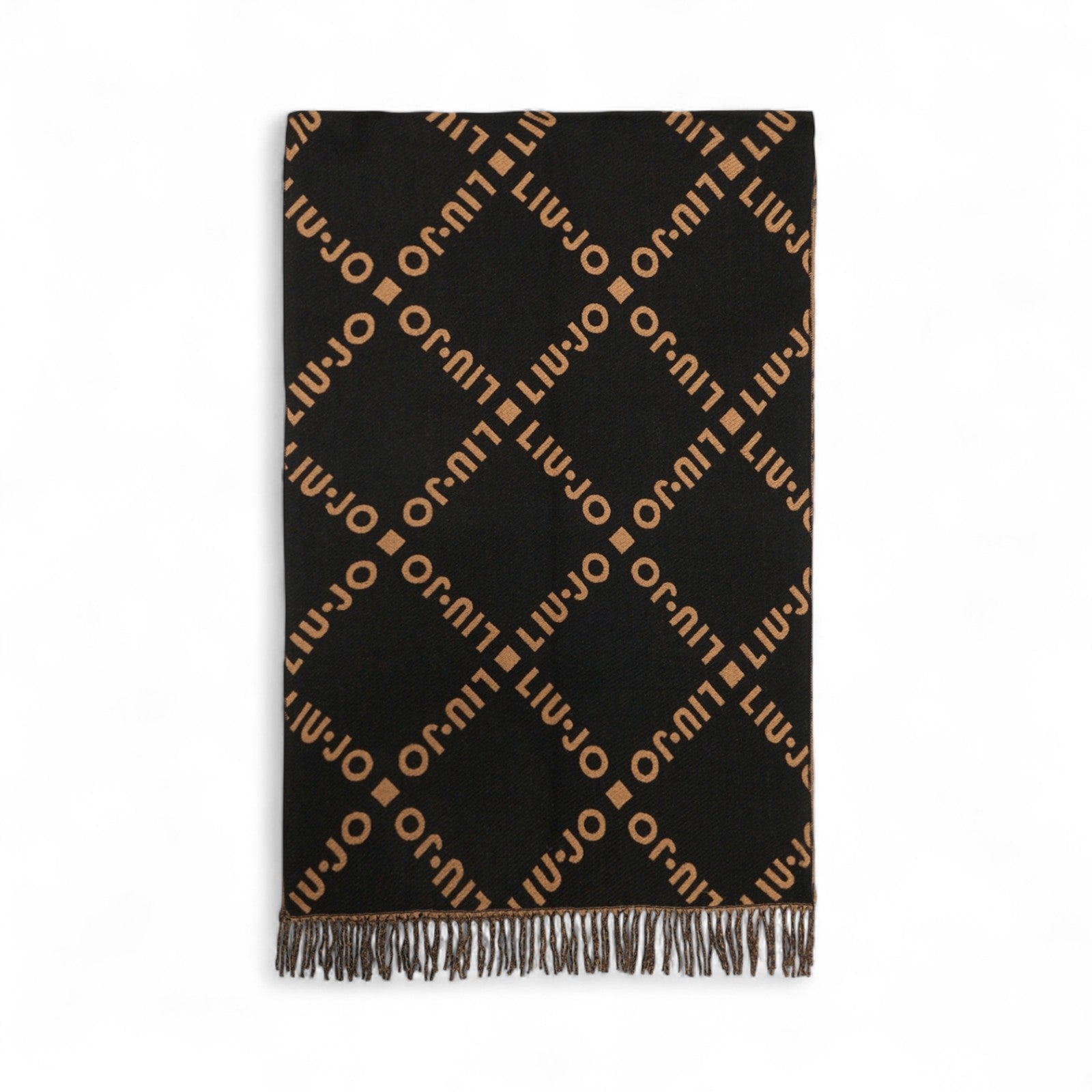 Stola nera. Realizzata in misto viscosa. Logo jacquard. Bordi con frange.