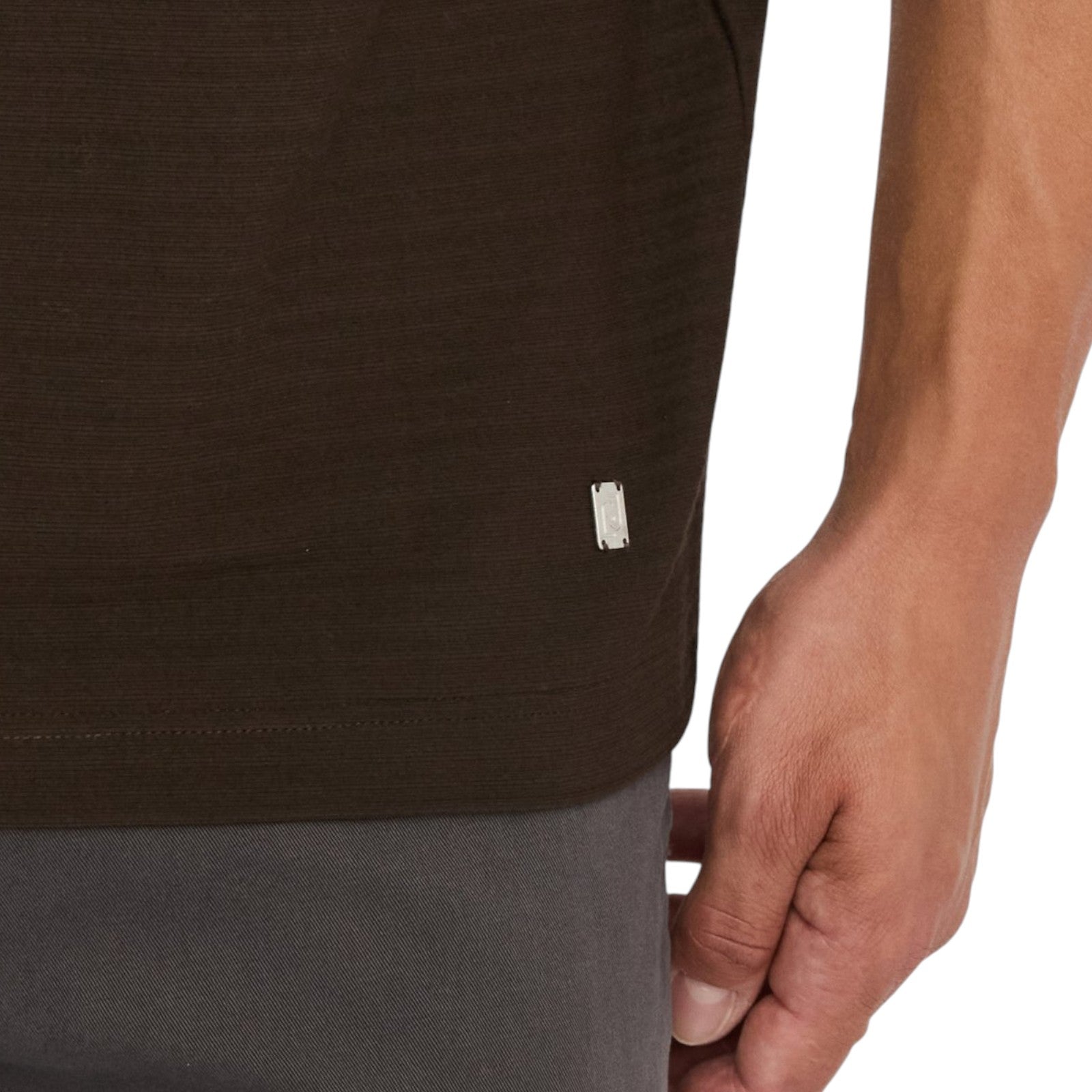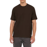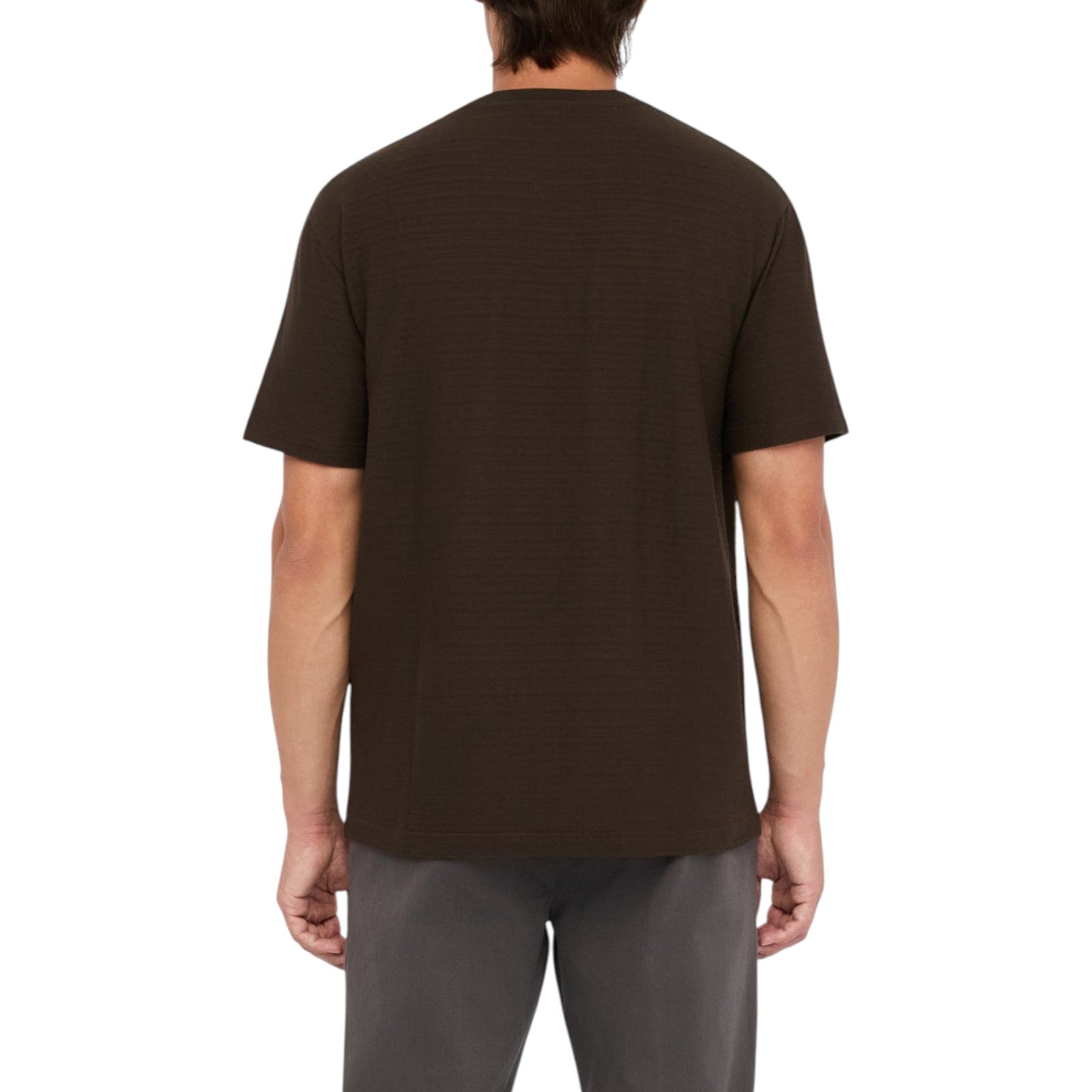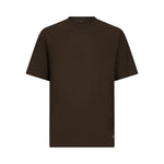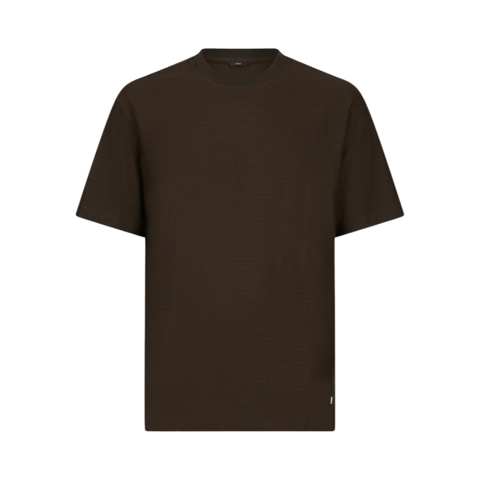 T-shirt marrone. Realizzata in cotone stretch. Lavorazione a righe. Taglio girocollo. Maniche corte. Logo in metallo al fondo.