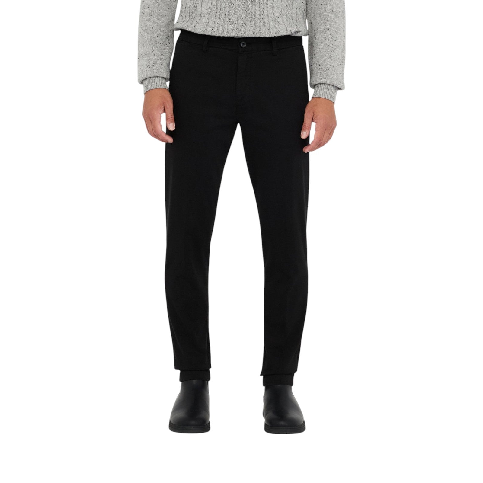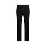 Pantaloni chino neri. Realizzati in cotone stretch. Piega stirata. Tasche sui fianchi. Tasche a filetto sul retro. Chiusura con bottone e zip coperta.