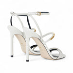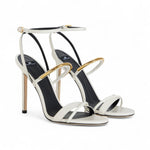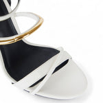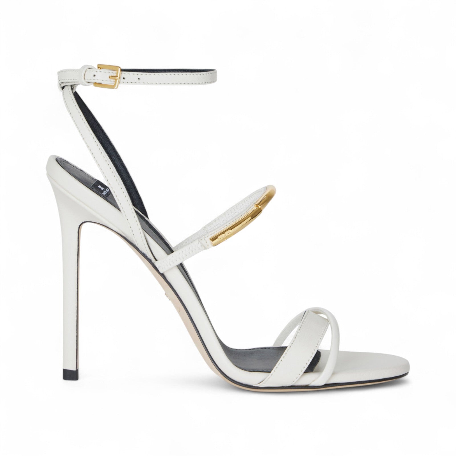 Sandali realizzati in pelle con tacco stiletto e cinturino alla caviglia. Si distinguono per il dettaglio a mezza luna in metallo dorato con logo laterale.