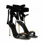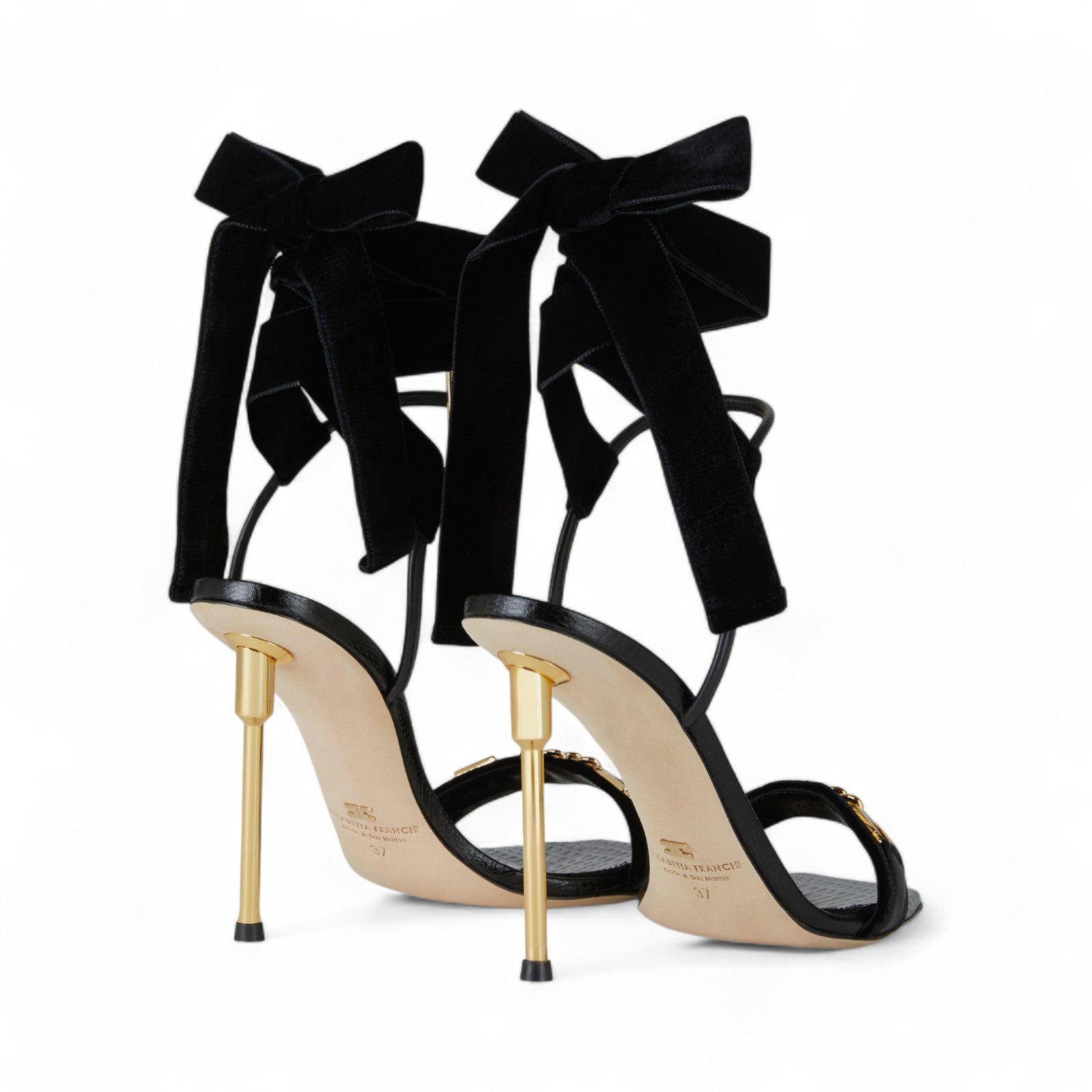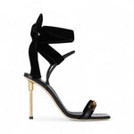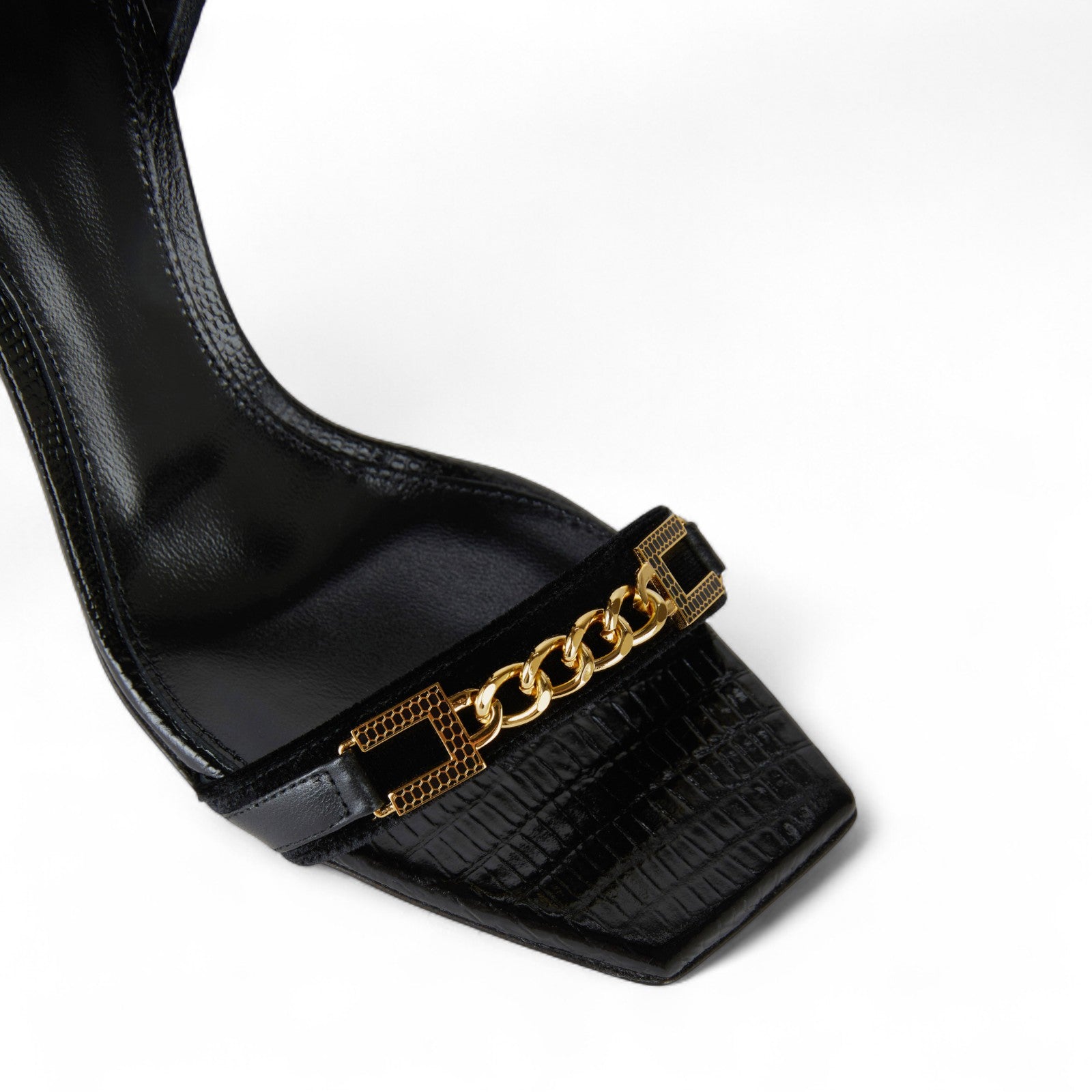 Sandali realizzati in tessuto nappato. Si distinguono per il design essenziale arricchito da nastri in velluto che avvolgono la caviglia e per il tacco scultura con finitura dorata che regala una linea geometrica e decisa. Un dettaglio in catena con logo sul listino anteriore completa l'accessorio.